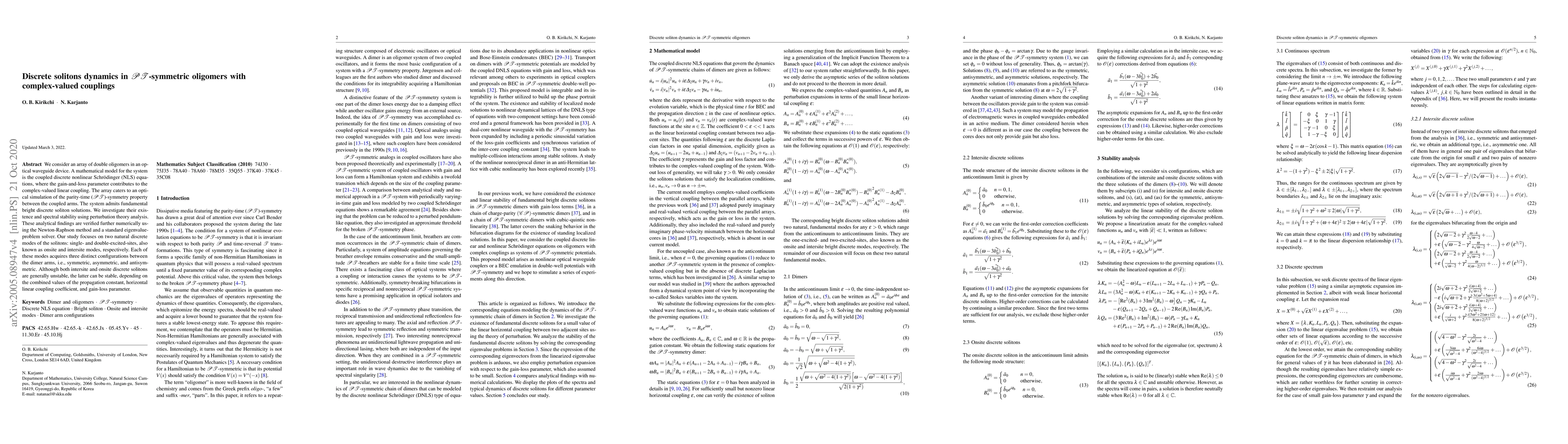 This paper investigates discrete soliton dynamics in $\cal{PT}$-symmetric optical oligomers with complex-valued couplings, using coupled discrete nonlinear Schrödinger equations. It finds that while intersite solitons are unstable, the onsite solitons can be stable under specific conditions, verified through perturbation theory and numerical methods.