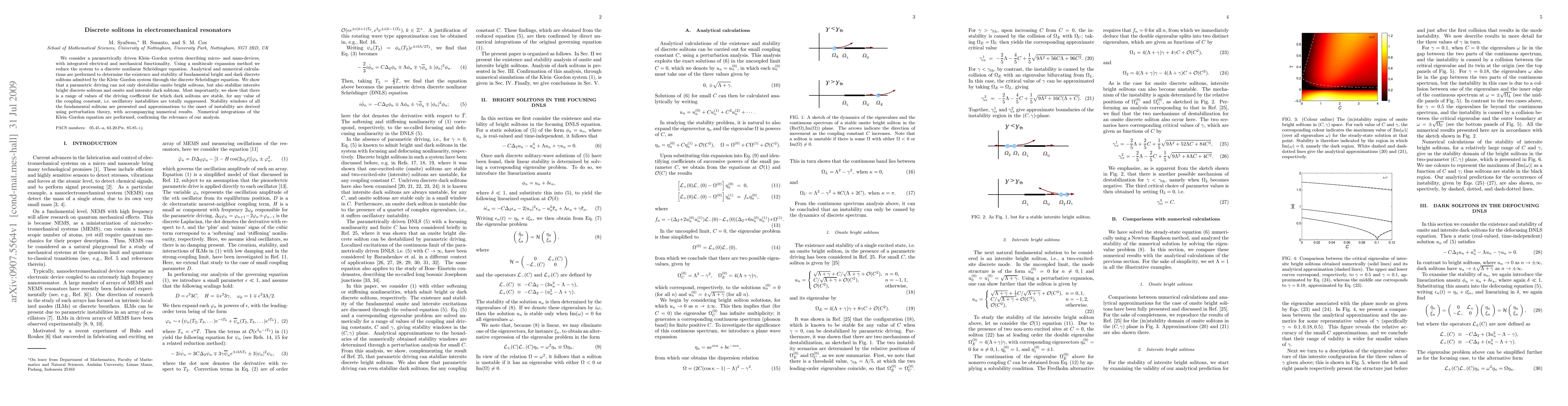 This paper studies discrete solitons in electromechanical resonators modeled by a parametrically driven Klein-Gordon system, reduced to a discrete nonlinear Schrödinger equation. It finds that parametric driving can stabilize intersite bright and onsite/intersite dark solitons, with dark solitons remaining stable over a range of driving coefficients, suppressing oscillatory instabilities.