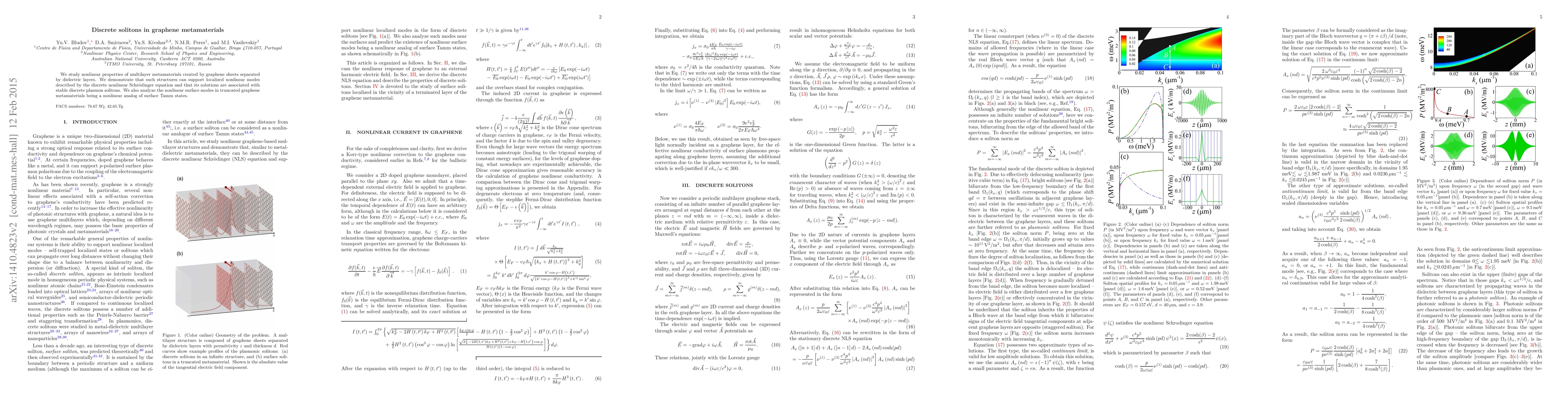 This paper investigates multilayer graphene metamaterials with dielectric separations, revealing their ability to support stable discrete plasmon solitons described by the discrete nonlinear Schrödinger equation. The study also examines nonlinear surface modes in truncated graphene metamaterials, analogous to surface Tamm states.