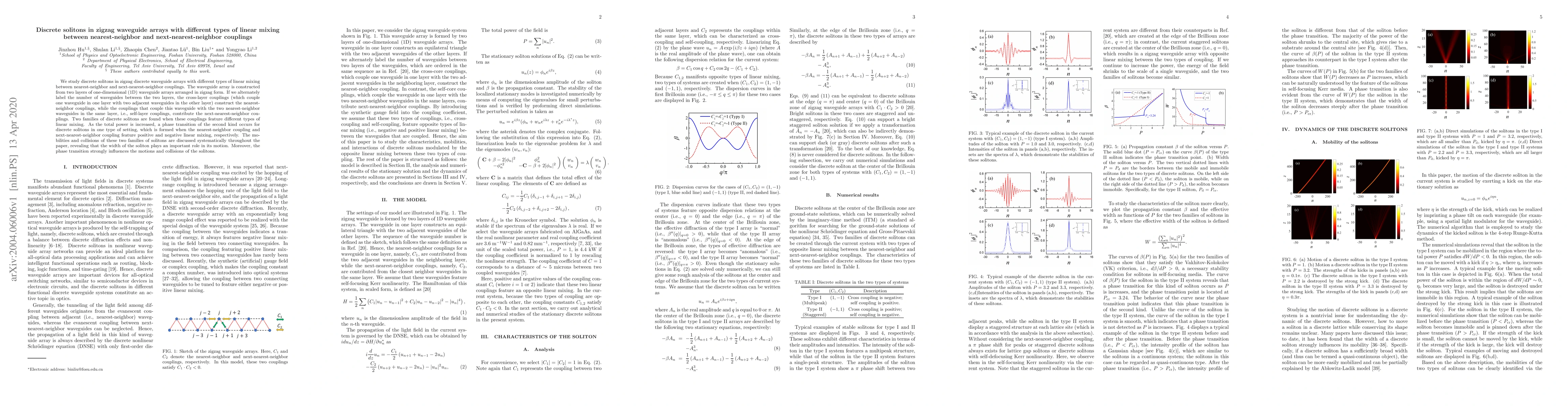 This paper investigates discrete solitons in zigzag waveguide arrays with varying linear mixing between nearest-neighbor and next-nearest-neighbor couplings. It finds two families of solitons and observes a phase transition with increasing power, highlighting the influence of soliton width on mobility and collision dynamics.