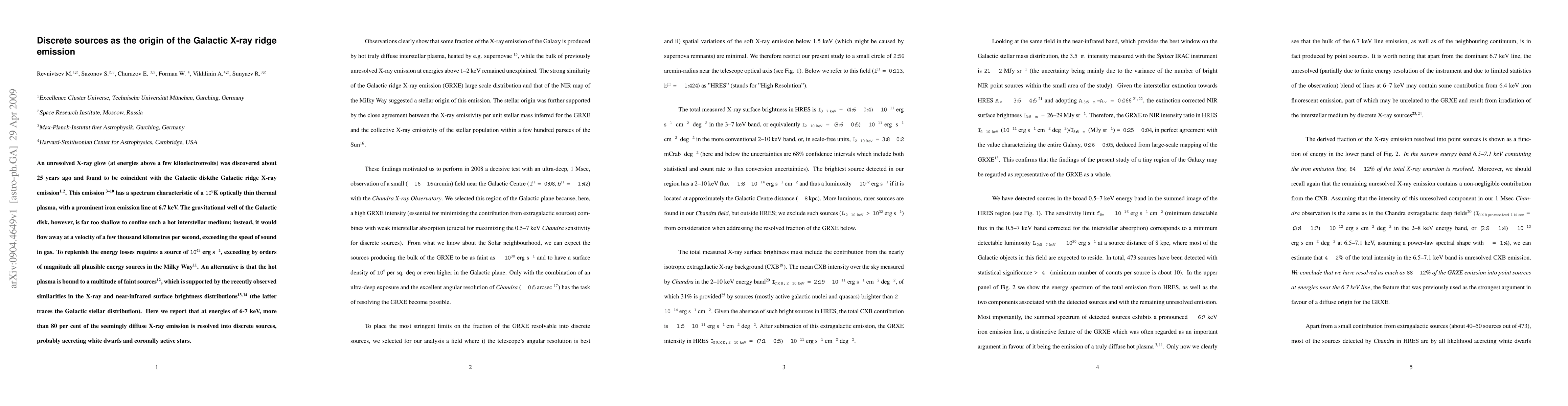 This paper proposes that the Galactic X-ray ridge emission, previously thought to be an unresolved thermal plasma, is primarily composed of discrete sources such as accreting white dwarfs and coronally active stars. The study finds that over 80% of the emission at 6-7 keV can be attributed to these faint sources, resolving the longstanding energy replenishment mystery.