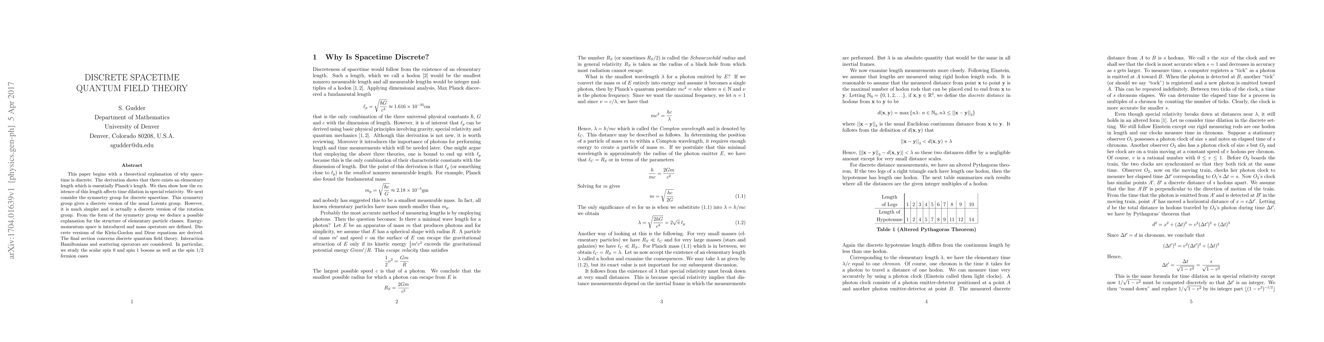 This paper begins with a theoretical explanation of why spacetime is discrete. The derivation shows that there exists an elementary length which is essentially Planck's length. We then show how the existence of this length affects time dilation in special relativity. We next consider the symmetry group for discrete spacetime. This symmetry group gives a discrete version of the usual Lorentz group. However, it is much simpler and is actually a discrete version of the rotation group. From the form of the symmetry group we deduce a possible explanation for the structure of elementary particle classes. Energy-momentum space is introduced and mass operators are defined. Discrete versions of the Klein-Gordon and Dirac equations are derived. The final section concerns discrete quantum field theory. Interaction Hamiltonians and scattering operators are considered. In particular, we study the scalar spin~0 and spin~1 bosons as well as the spin~$1/2$ fermion cases