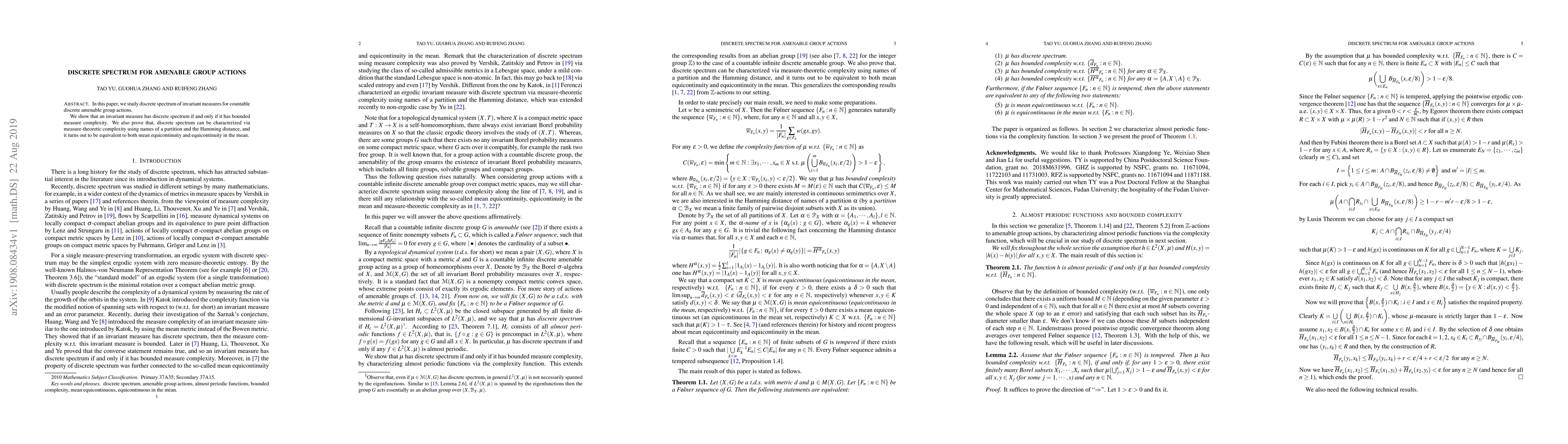 This paper explores the discrete spectrum of invariant measures for countable amenable group actions, proving that such measures have discrete spectrum if and only if they exhibit bounded measure complexity. It also establishes equivalence between discrete spectrum and measure-theoretic complexity, mean equicontinuity, and equicontinuity in the mean.