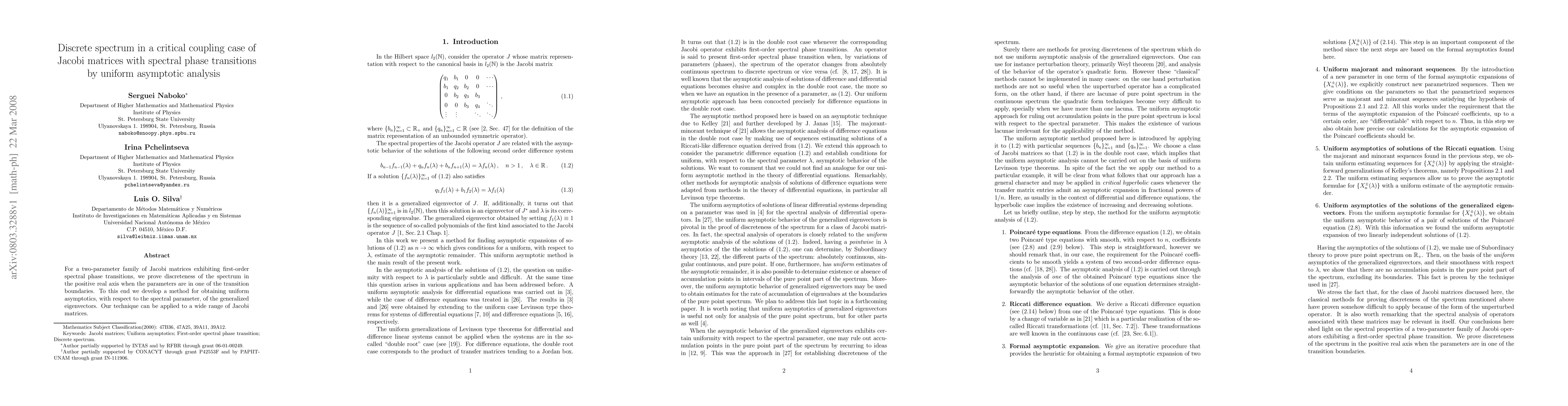 For a two-parameter family of Jacobi matrices exhibiting first-order spectral phase transitions, we prove discreteness of the spectrum in the positive real axis when the parameters are in one of the transition boundaries. To this end we develop a method for obtaining uniform asymptotics, with respect to the spectral parameter, of the generalized eigenvectors. Our technique can be applied to a wide range of Jacobi matrices.