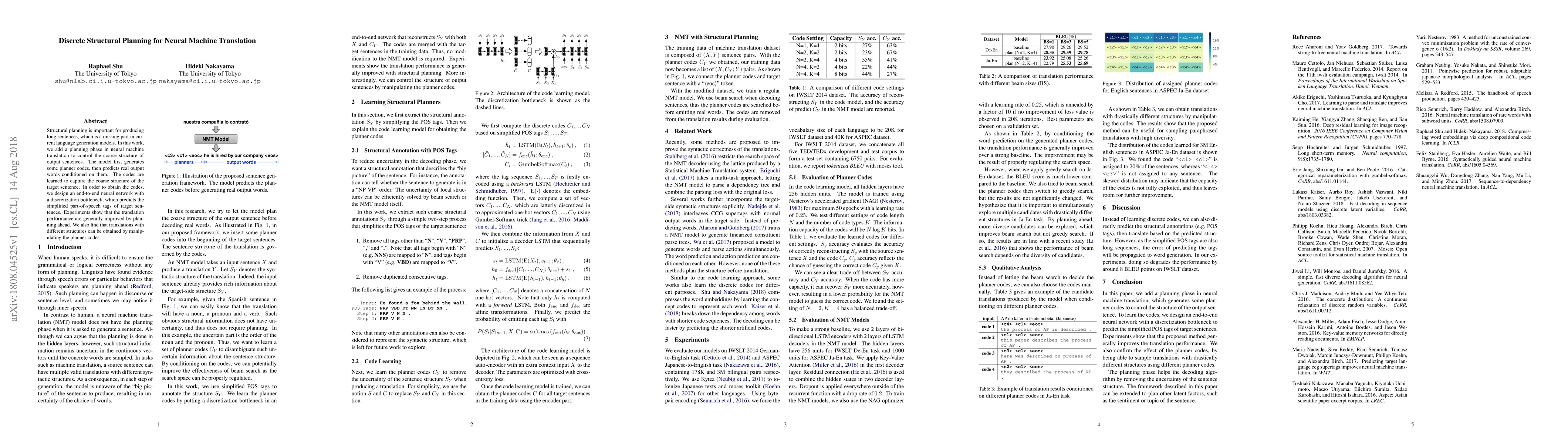 This paper introduces a discrete structural planning phase in neural machine translation to enhance long sentence generation. The model generates planner codes to capture the target sentence's coarse structure, improving translation performance and allowing for varied sentence structures through code manipulation.