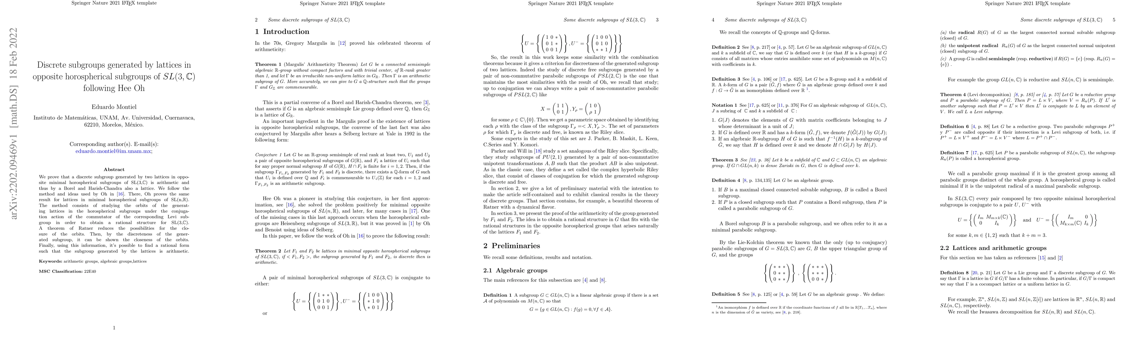 We prove that a discrete subgroup generated by two lattices in opposite minimal horospherical subgroups of $SL(3,\mathbb{C})$ is arithmetic and thus by a Borel and Harish-Chandra also a lattice. We follow the method and ideas used by Oh in \cite{Ref13}. There, Oh proves the same result for lattices in minimal horospherical subgroups of $SL(n,\mathbb{R})$. The method consists of studying the orbits of the generating lattices in the horospherical subgroups under the conjugation action of the commutator of the corresponding Levi subgroup in order to obtain a rational structure for $SL(3,\mathbb{C})$. A theorem of Ratner reduces the possibilities for the closure of the orbits. Then, by the discreteness of the generated subgroup, it can be shown the closeness of the orbits. Finally, using this information, it's possible to find a rational form such that the subgroup generated by the lattices is arithmetic.