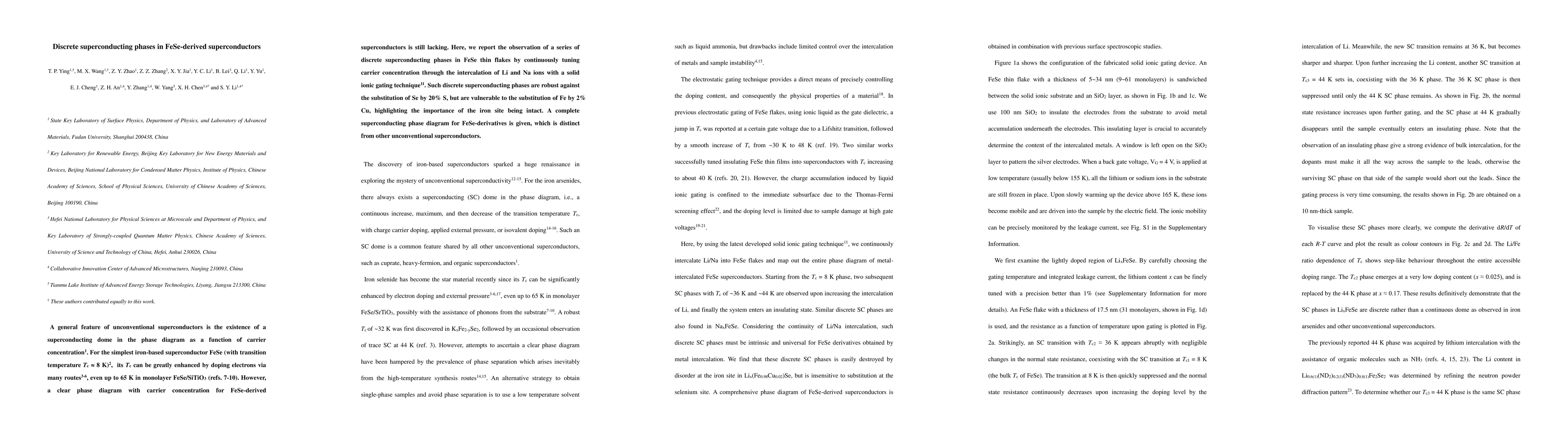 This paper reports the discovery of discrete superconducting phases in FeSe thin flakes by doping with Li and Na ions, revealing a distinct superconducting phase diagram for FeSe-derived superconductors. The observed phases are stable against Se substitution but sensitive to Fe substitution, emphasizing the critical role of the iron site in superconductivity.