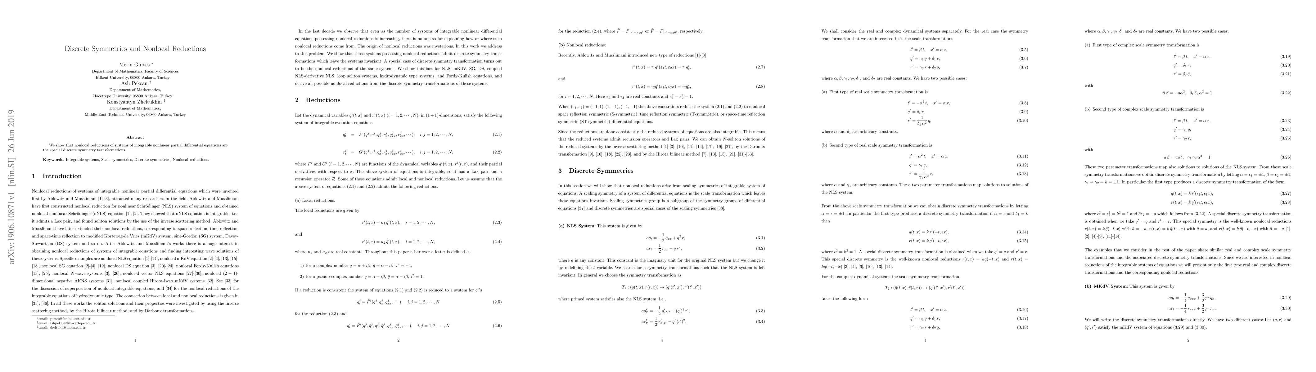 Summary: This paper demonstrates that nonlocal reductions of integrable nonlinear partial differential equations correspond to specific discrete symmetry transformations. The findings highlight the deep connection between nonlocal reductions and discrete symmetries in integrable systems.