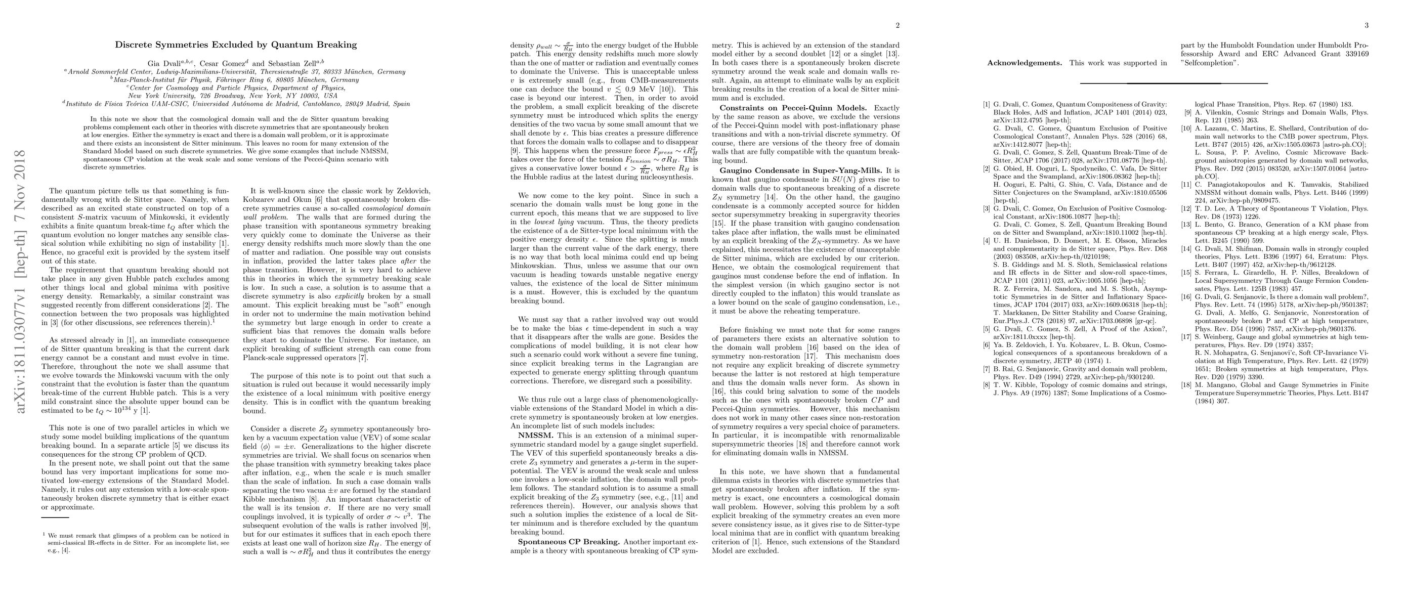 In this note we show that the cosmological domain wall and the de Sitter quantum breaking problems complement each other in theories with discrete symmetries that are spontaneously broken at low energies. Either the symmetry is exact and there is a domain wall problem, or it is approximate and there exists an inconsistent de Sitter minimum. This leaves no room for many extension of the Standard Model based on such discrete symmetries. We give some examples that include NMSSM, spontaneous CP violation at the weak scale and some versions of the Peccei-Quinn scenario with discrete symmetries.