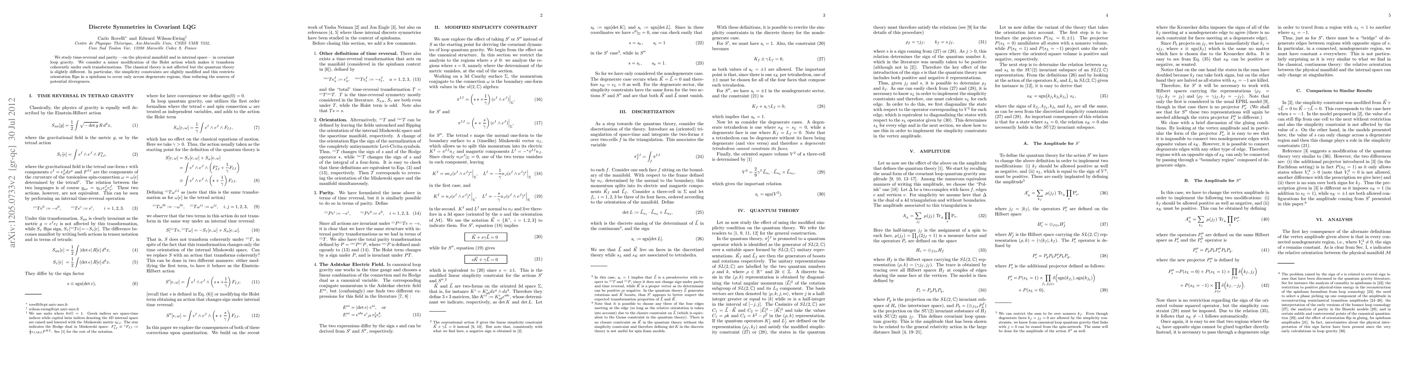 We study time-reversal and parity ---on the physical manifold and in internal space--- in covariant loop gravity. We consider a minor modification of the Holst action which makes it transform coherently under such transformations. The classical theory is not affected but the quantum theory is slightly different. In particular, the simplicity constraints are slightly modified and this restricts orientation flips in a spinfoam to occur only across degenerate regions, thus reducing the sources of potential divergences.