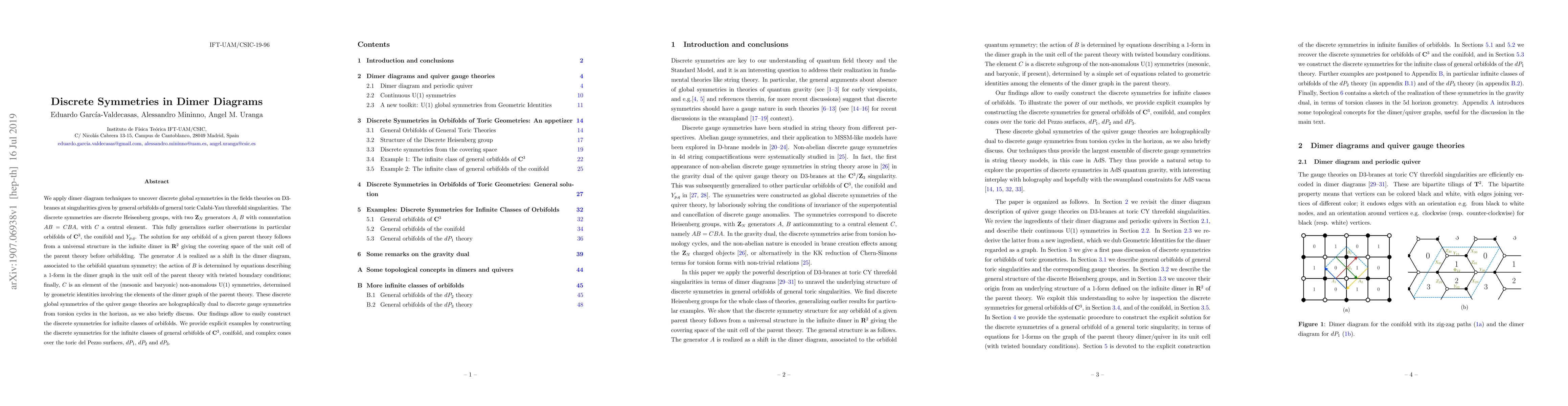 We apply dimer diagram techniques to uncover discrete global symmetries in the fields theories on D3-branes at singularities given by general orbifolds of general toric Calabi-Yau threefold singularities. The discrete symmetries are discrete Heisenberg groups, with two $\mathbf{Z}_N$ generators $A$, $B$ with commutation $AB=CBA$, with $C$ a central element. This fully generalizes earlier observations in particular orbifolds of $\mathbf{C}^3$, the conifold and $Y_{p,q}$. The solution for any orbifold of a given parent theory follows from a universal structure in the infinite dimer in $\mathbf{R}^2$ giving the covering space of the unit cell of the parent theory before orbifolding. The generator $A$ is realized as a shift in the dimer diagram, associated to the orbifold quantum symmetry; the action of $B$ is determined by equations describing a 1-form in the dimer graph in the unit cell of the parent theory with twisted boundary conditions; finally, $C$ is an element of the (mesonic and baryonic) non-anomalous U$(1)$ symmetries, determined by geometric identities involving the elements of the dimer graph of the parent theory. These discrete global symmetries of the quiver gauge theories are holographically dual to discrete gauge symmetries from torsion cycles in the horizon, as we also briefly discuss. Our findings allow to easily construct the discrete symmetries for infinite classes of orbifolds. We provide explicit examples by constructing the discrete symmetries for the infinite classes of general orbifolds of $\mathbf{C}^3$, conifold, and complex cones over the toric del Pezzo surfaces, $dP_1$, $dP_2$ and $dP_3$.
