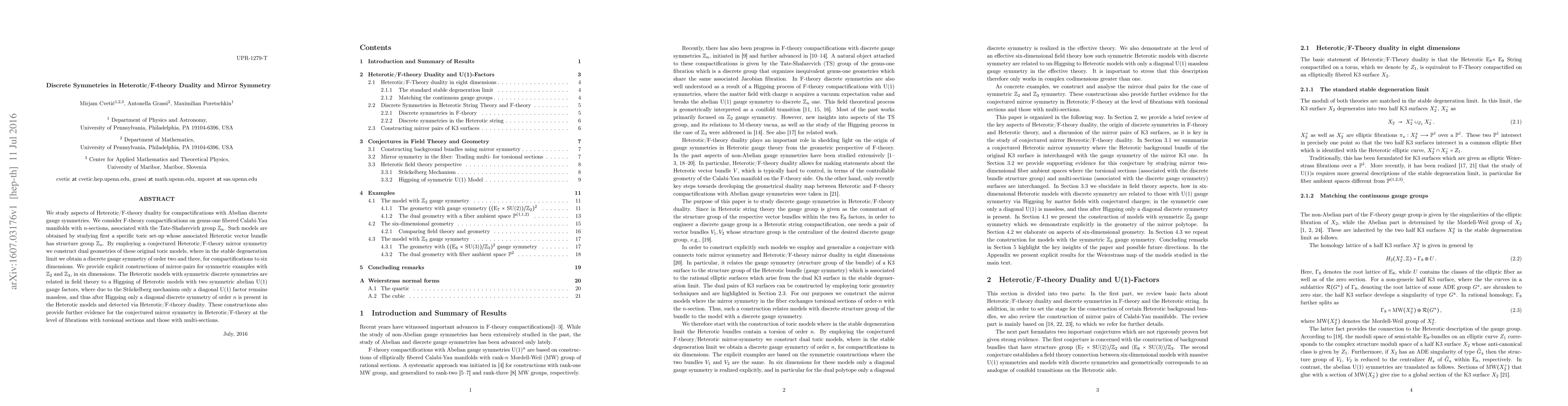 This paper explores Heterotic/F-theory duality in compactifications with Abelian discrete gauge symmetries, specifically through genus-one fibered Calabi-Yau manifolds with n-sections. It constructs mirror geometries for symmetric examples with Z_2 and Z_3 symmetries in six dimensions, supporting the conjectured Heterotic/F-theory mirror symmetry.