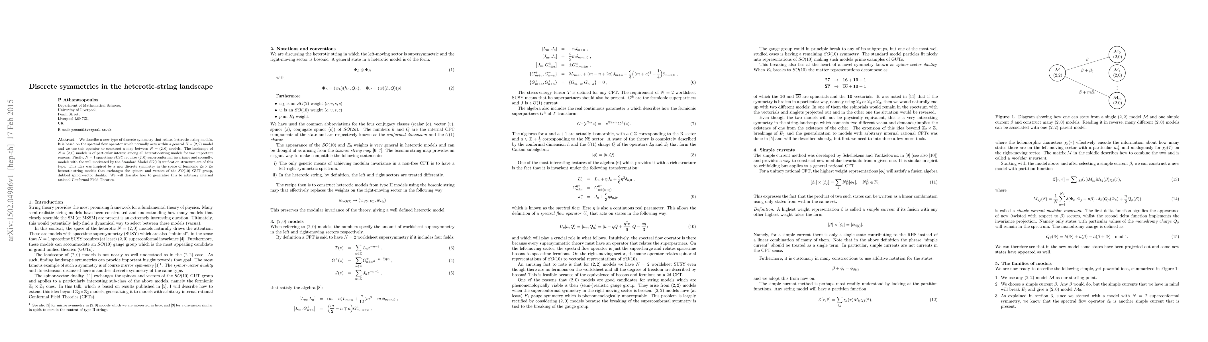 We describe a new type of discrete symmetry that relates heterotic-string models. It is based on the spectral flow operator which normally acts within a general N=(2,2) model and we use this operator to construct a map between N=(2,0) models. The landscape of N=(2,0) models is of particular interest among all heterotic-string models for two important reasons: Firstly, N=1 spacetime SUSY requires (2,0) superconformal invariance and secondly, models with the well motivated by the Standard Model SO(10) unification structure are of this type. This idea was inspired by a new discrete symmetry in the space of fermionic $\mathbb{Z}_2\times \mathbb{Z}_2$ heterotic-string models that exchanges the spinors and vectors of the SO(10) GUT group, dubbed spinor-vector duality. We will describe how to generalize this to arbitrary internal rational Conformal Field Theories.