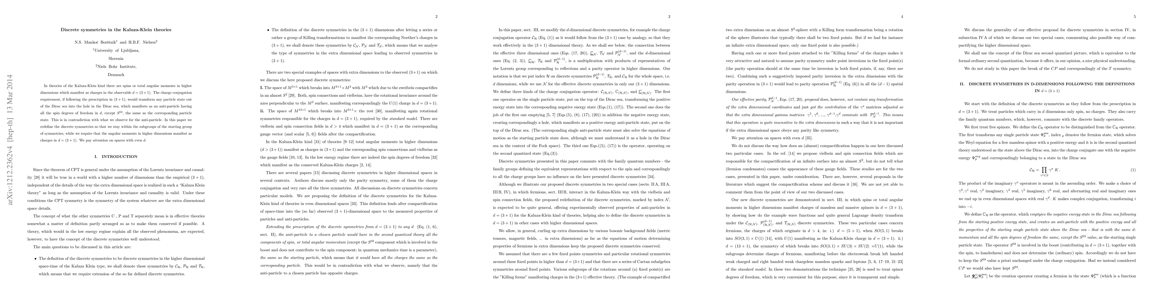 In theories of the Kaluza-Klein kind there are spins or total angular moments in higher dimensions which manifest as charges in the observable $d=(3+1)$. The charge conjugation requirement, if following the prescription in ($3+1$), would transform any particle state out of the Dirac sea into the hole in the Dirac sea, which manifests as an anti-particle having all the spin degrees of freedom in $d$, except $S^{03}$, the same as the corresponding particle state. This is in contradiction with what we observe for the anti-particle. In this paper we redefine the discrete symmetries so that we stay within the subgroups of the starting group of symmetries, while we require that the angular moments in higher dimensions manifest as charges in $d=(3+1)$. We pay attention on spaces with even $d$.