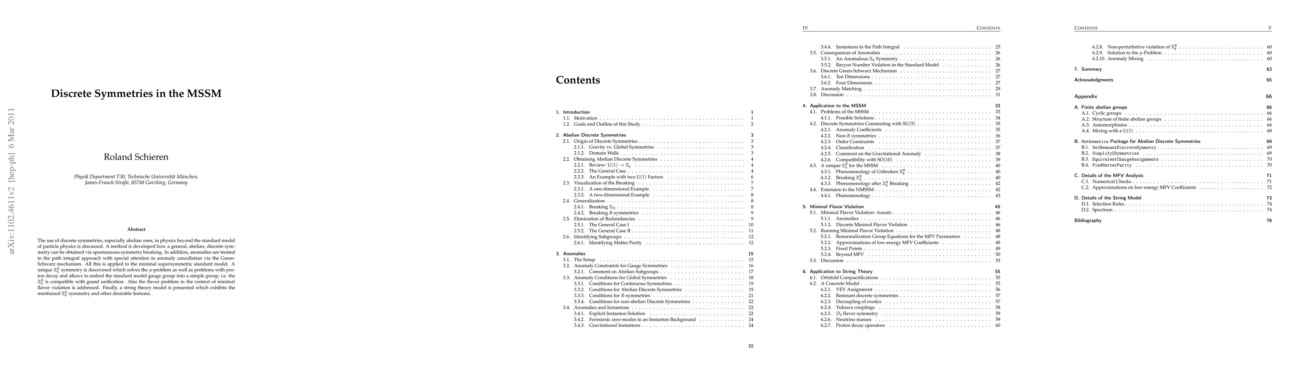 The use of discrete symmetries, especially abelian ones, in physics beyond the standard model of particle physics is discussed. A method is developed how a general, abelian, discrete symmetry can be obtained via spontaneous symmetry breaking. In addition, anomalies are treated in the path integral approach with special attention to anomaly cancellation via the Green-Schwarz mechanism. All this is applied to the minimal supersymmetric standard model. A unique Z_4^R symmetry is discovered which solves the \mu-problem as well as problems with proton decay and allows to embed the standard model gauge group into a simple group, i.e. the Z_4^R is compatible with grand unification. Also the flavor problem in the context of minimal flavor violation is addressed. Finally, a string theory model is presented which exhibits the mentioned Z_4^R symmetry and other desirable features.