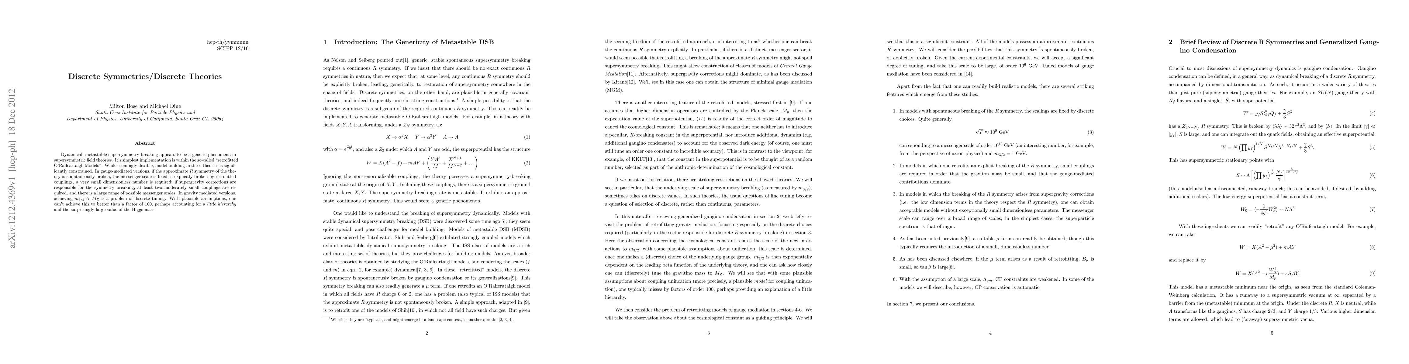 Dynamical, metastable supersymmetry breaking appears to be a generic phenomena in supersymmetric field theories. It's simplest implementation is within the so-called "retrofitted O'Raifeartaigh Models". While seemingly flexible, model building in these theories is significantly constrained. In gauge-mediated versions, if the approximate $R$ symmetry of the theory is spontaneously broken, the messenger scale is fixed; if explicitly broken by retrofitted couplings, a very small dimensionless number is required; if supergravity corrections are responsible for the symmetry breaking, at least two moderately small couplings are required, and there is a large range of possible messenger scales. In gravity mediated versions, achieving $m_{3/2} \approx M_Z$ is a problem of discrete tuning. With plausible assumptions, one can't achieve this to better than a factor of 100, perhaps accounting for a {\it little hierarchy} and the surprisingly large value of the Higgs mass.