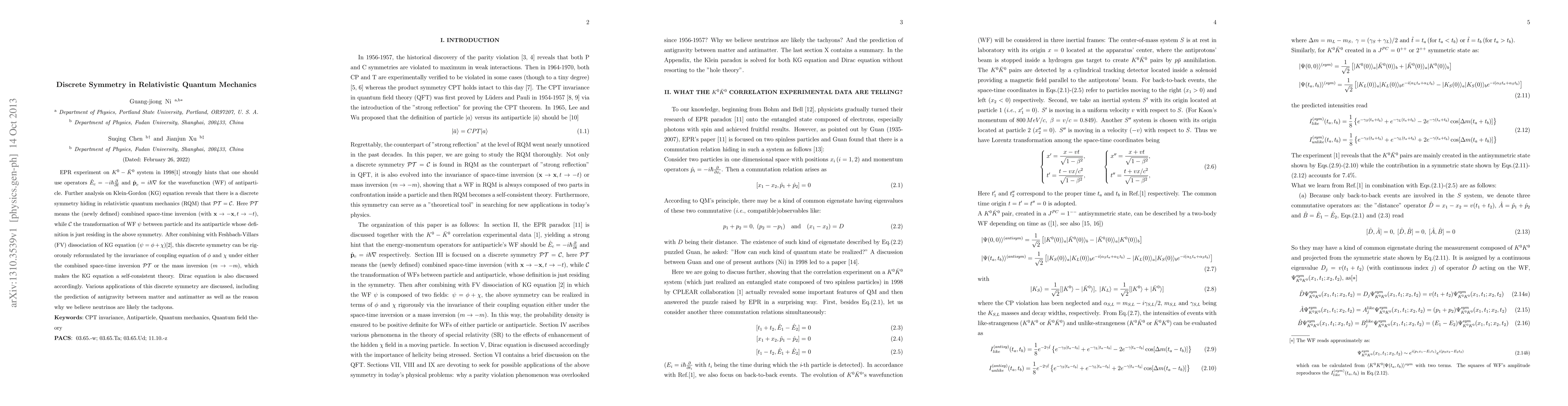 EPR experiment on $K^0-\bar{K}^0$ system in 1998\cite{1} strongly hints that one should use operators $\hat{E}_c=-i\hbar\frac{\partial}{\partial t}$ and $\hat{\bf p}_c=i\hbar\nabla$ for the wavefunction (WF) of antiparticle. Further analysis on Klein-Gordon (KG) equation reveals that there is a discrete symmetry hiding in relativistic quantum mechanics (RQM) that ${\cal P}{\cal T}={\cal C}$. Here ${\cal P}{\cal T}$ means the (newly defined) combined space-time inversion (with ${\bf x}\to -{\bf x}, t\to-t$), while ${\cal C}$ the transformation of WF $\psi$ between particle and its antiparticle whose definition is just residing in the above symmetry. After combining with Feshbach-Villars (FV) dissociation of KG equation ($\psi=\phi+\chi$)\cite{2}, this discrete symmetry can be rigorously reformulated by the invariance of coupling equation of $\phi$ and $\chi$ under either the combined space-time inversion ${\cal P}{\cal T}$ or the mass inversion ($m\to -m$), which makes the KG equation a self-consistent theory. Dirac equation is also discussed accordingly. Various applications of this discrete symmetry are discussed, including the prediction of antigravity between matter and antimatter as well as the reason why we believe neutrinos are likely the tachyons.
