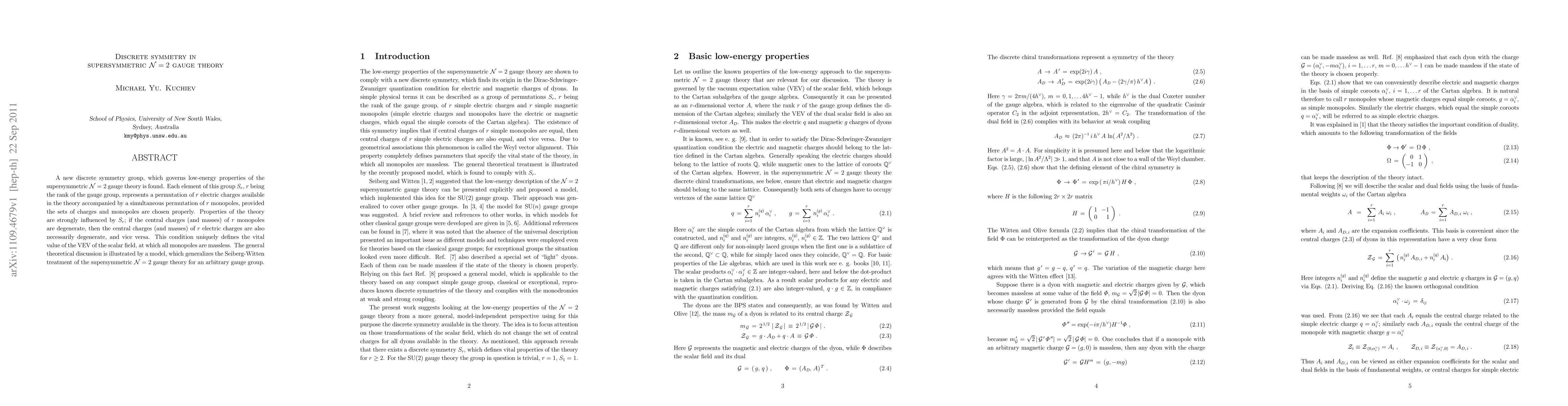 This research discovers a new discrete symmetry group, S_r, governing low-energy properties in supersymmetric N=2 gauge theory, where r is the gauge group's rank. This symmetry links permutations of electric charges and monopoles, with degeneracy in monopole central charges dictating degeneracy in electric charge central charges, thus defining a critical scalar field value for massless monopoles.