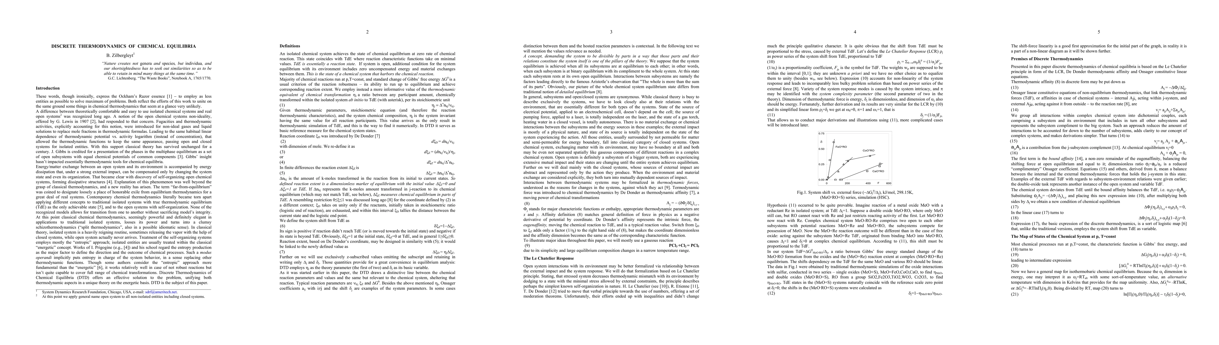 The paper introduces Discrete Thermodynamics of Chemical Equilibria (DTD), a novel theory that integrates classical and contemporary thermodynamics principles to describe chemical equilibria as a balance of internal and external thermodynamic forces. The theory employs a logistic map to analyze system deviations from thermodynamic equilibrium and presents bifurcation diagrams with four distinct areas, offering new insights into chemical systems.