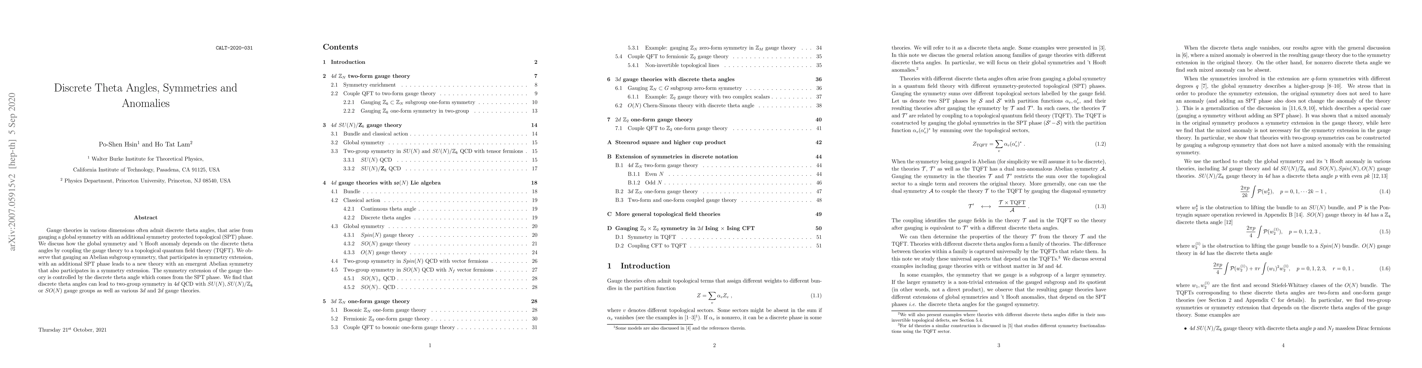 Gauge theories in various dimensions often admit discrete theta angles, that arise from gauging a global symmetry with an additional symmetry protected topological (SPT) phase. We discuss how the global symmetry and 't Hooft anomaly depends on the discrete theta angles by coupling the gauge theory to a topological quantum field theory (TQFT). We observe that gauging an Abelian subgroup symmetry, that participates in symmetry extension, with an additional SPT phase leads to a new theory with an emergent Abelian symmetry that also participates in a symmetry extension. The symmetry extension of the gauge theory is controlled by the discrete theta angle which comes from the SPT phase. We find that discrete theta angles can lead to two-group symmetry in 4d QCD with $SU(N),SU(N)/\mathbb{Z}_k$ or $SO(N)$ gauge groups as well as various 3d and 2d gauge theories.