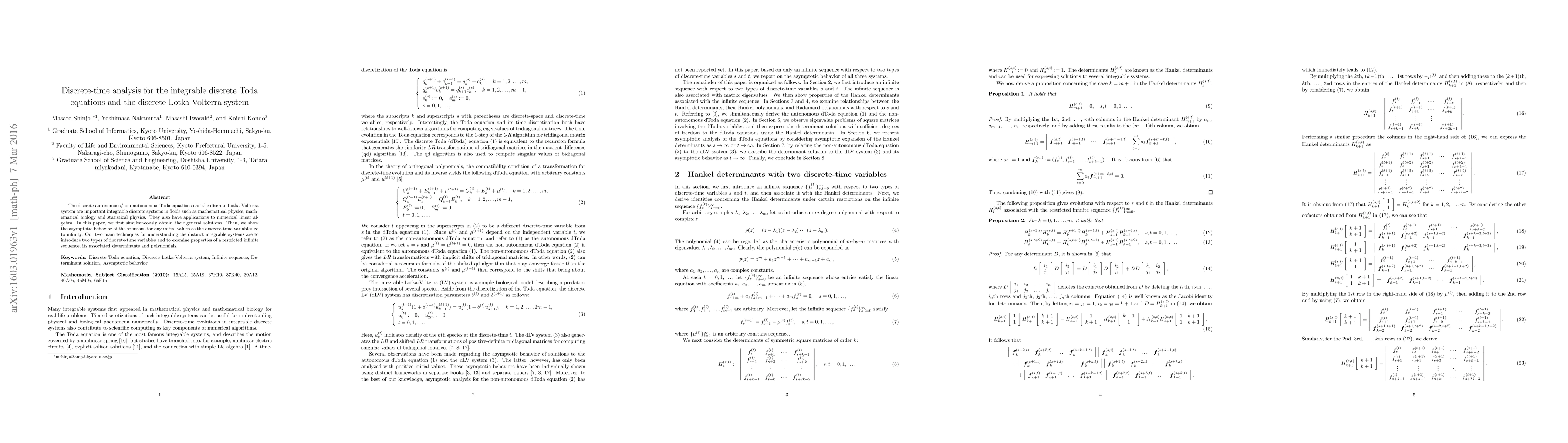 The discrete autonomous/non-autonomous Toda equations and the discrete Lotka-Volterra system are important integrable discrete systems in fields such as mathematical physics, mathematical biology and statistical physics. They also have applications to numerical linear algebra. In this paper, we first simultaneously obtain their general solutions. Then, we show the asymptotic behavior of the solutions for any initial values as the discrete-time variables go to infinity. Our two main techniques for understanding the distinct integrable systems are to introduce two types of discrete-time variables and to examine properties of a restricted infinite sequence, its associated determinants and polynomials.