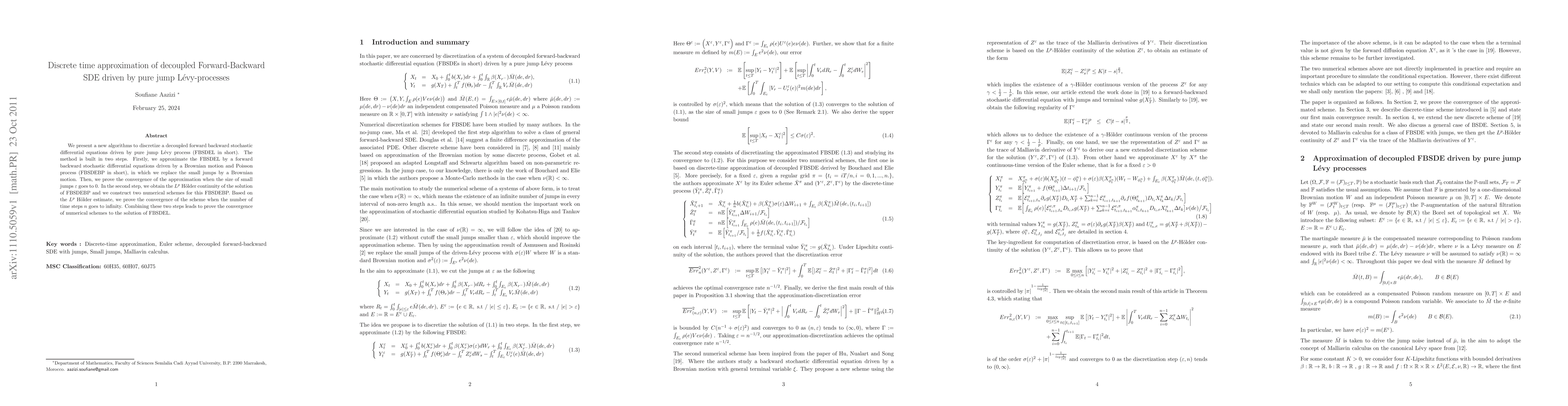 We present a new algorithms to discretize a decoupled forward backward stochastic differential equations driven by pure jump L\'evy process (FBSDEL in short). The method is built in two steps. Firstly, we approximate the FBSDEL by a forward backward stochastic differential equations driven by a Brownian motion and Poisson process (FBSDEBP in short), in which we replace the small jumps by a Brownian motion. Then, we prove the convergence of the approximation when the size of small jumps $\eps$ goes to 0. In the second step, we obtain the $L^p$ H\"older continuity of the solution of FBSDEBP and we construct two numerical schemes for this FBSDEBP. Based on the $L^p$ H\"older estimate, we prove the convergence of the scheme when the number of time steps $n$ goes to infinity. Combining these two steps leads to prove the convergence of numerical schemes to the solution of FBSDEL.