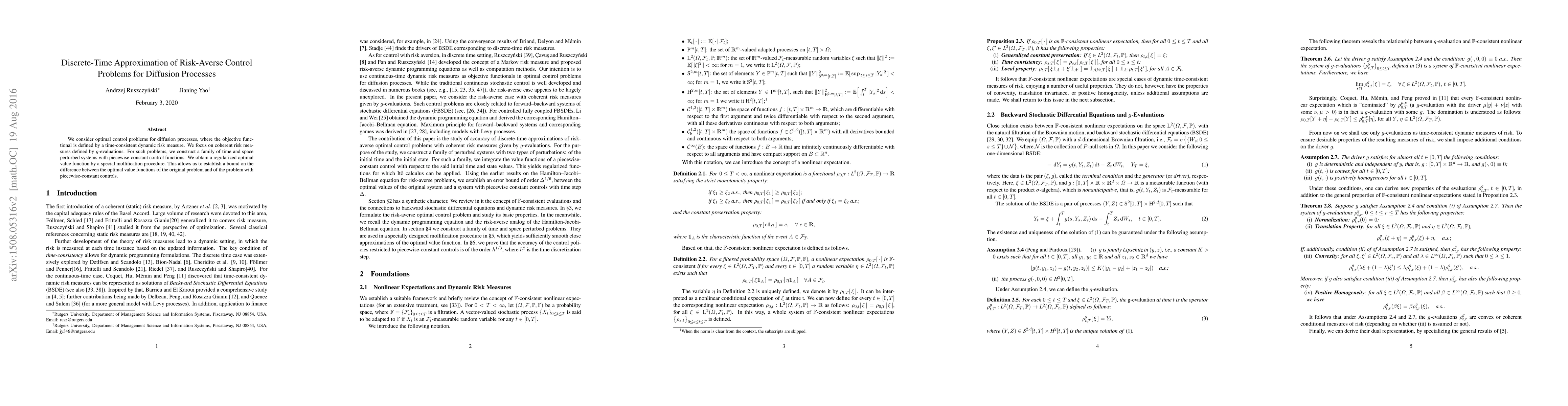 This paper addresses optimal control problems for diffusion processes with a risk-averse objective using coherent risk measures. It constructs perturbed systems with piecewise-constant controls and employs a mollification procedure to derive a regularized optimal value function, establishing a bound on the difference between the original and perturbed optimal value functions.