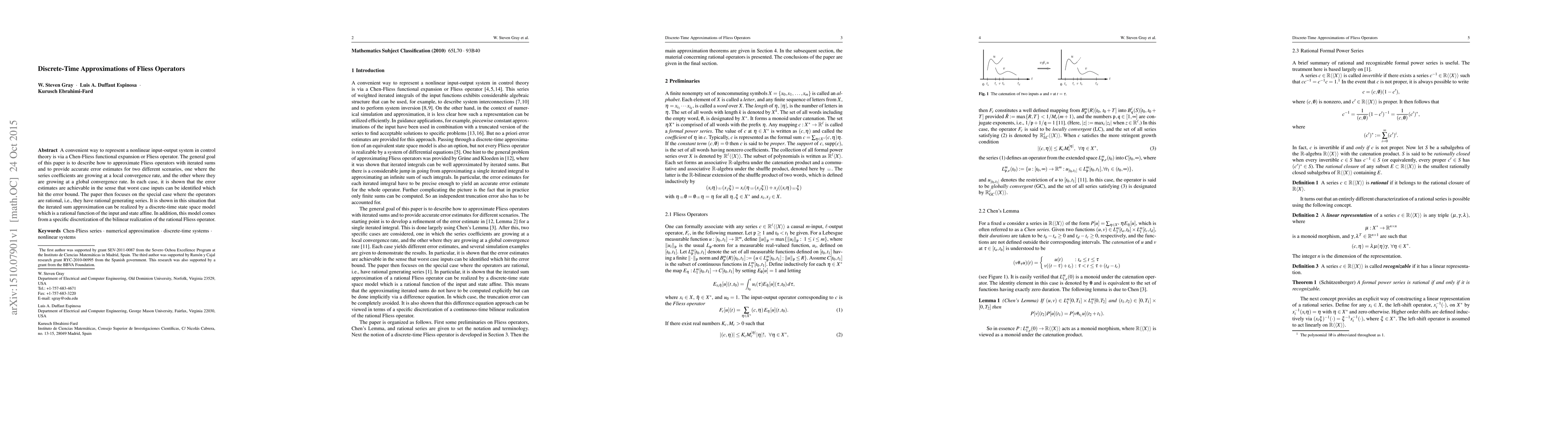 A convenient way to represent a nonlinear input-output system in control theory is via a Chen-Fliess functional expansion or Fliess operator. The general goal of this paper is to describe how to approximate Fliess operators with iterated sums and to provide accurate error estimates for two different scenarios, one where the series coefficients are growing at a local convergence rate, and the other where they are growing at a global convergence rate. In each case, it is shown that the error estimates are achievable in the sense that worst case inputs can be identified which hit the error bound. The paper then focuses on the special case where the operators are rational, i.e., they have rational generating series. It is shown in this situation that the iterated sum approximation can be realized by a discrete-time state space model which is a rational function of the input and state affine. In addition, this model comes from a specific discretization of the bilinear realization of the rational Fliess operator.