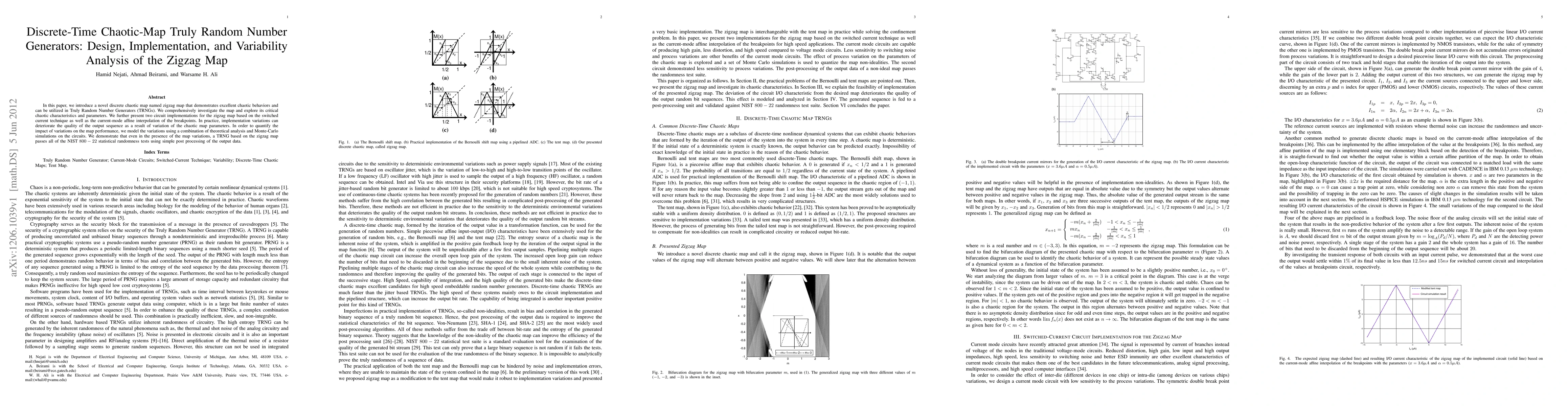 In this paper, we introduce a novel discrete chaotic map named zigzag map that demonstrates excellent chaotic behaviors and can be utilized in Truly Random Number Generators (TRNGs). We comprehensively investigate the map and explore its critical chaotic characteristics and parameters. We further present two circuit implementations for the zigzag map based on the switched current technique as well as the current-mode affine interpolation of the breakpoints. In practice, implementation variations can deteriorate the quality of the output sequence as a result of variation of the chaotic map parameters. In order to quantify the impact of variations on the map performance, we model the variations using a combination of theoretical analysis and Monte-Carlo simulations on the circuits. We demonstrate that even in the presence of the map variations, a TRNG based on the zigzag map passes all of the NIST 800-22 statistical randomness tests using simple post processing of the output data.