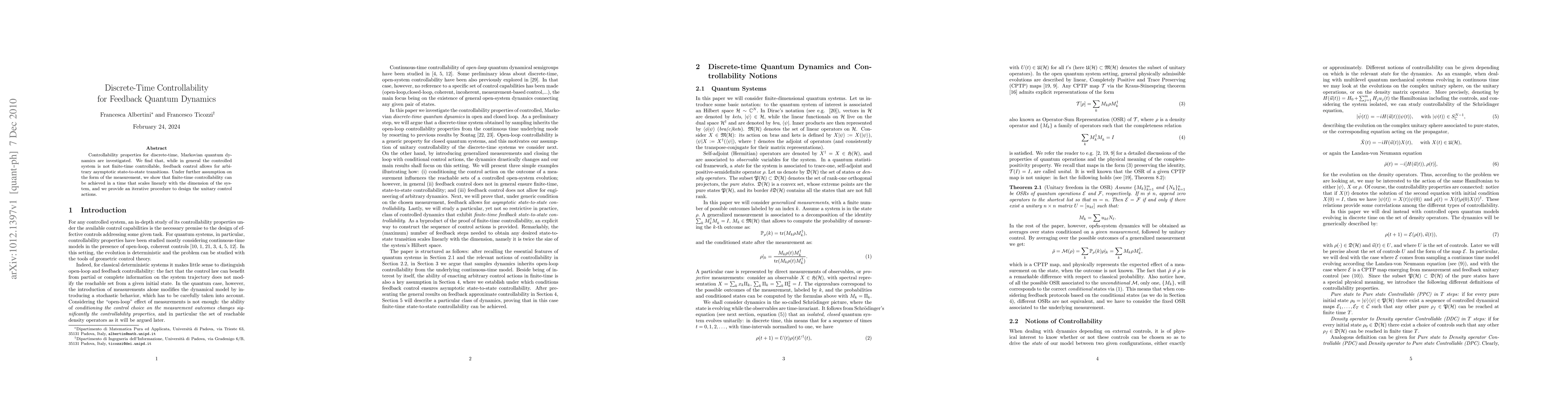 Researchers explored controllability in discrete-time quantum dynamics, finding that feedback control enables arbitrary asymptotic transitions. Finite-time controllability can be achieved with a linear scaling time dimension.