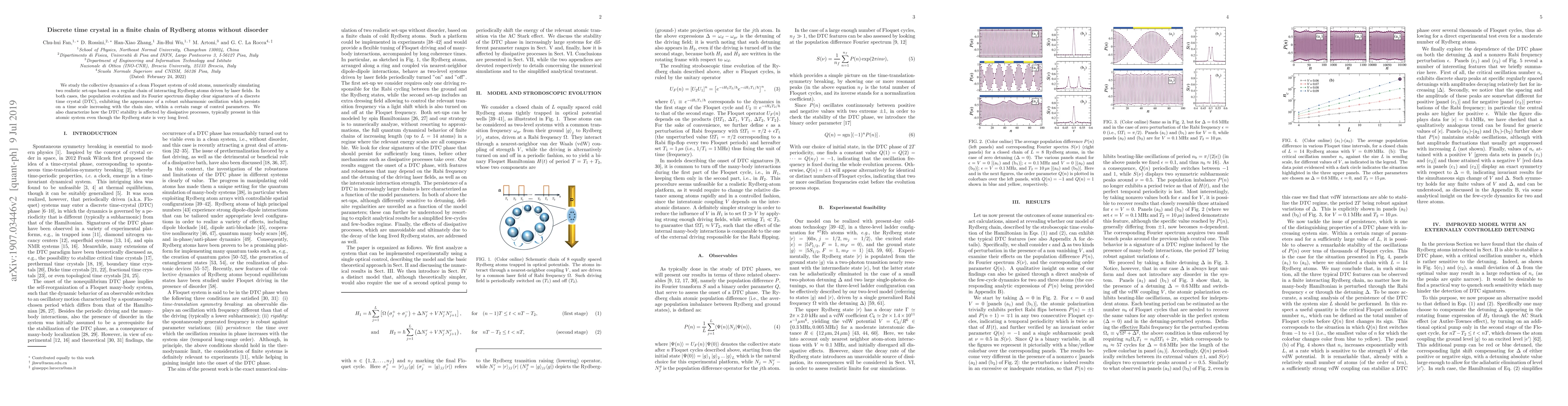 Summary: This study numerically investigates a clean Floquet system of Rydberg atoms in a regular chain, revealing signatures of a discrete time crystal (DTC) with robust subharmonic oscillations. The DTC's stability is also analyzed in the presence of dissipative processes inherent in the system.