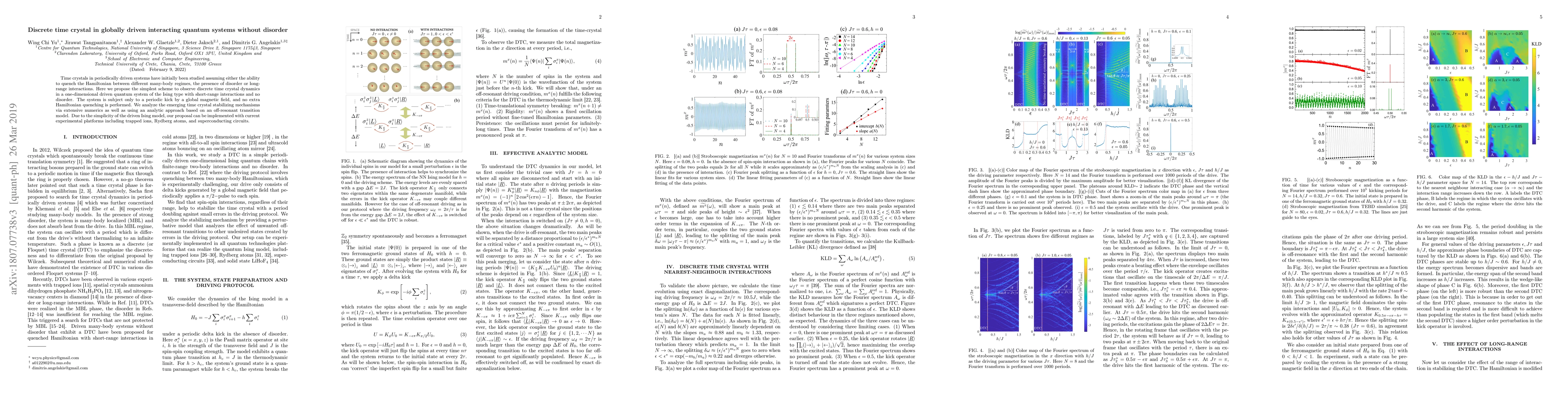 This paper proposes a simple method to observe discrete time crystal dynamics in a one-dimensional driven quantum Ising model with short-range interactions, driven solely by a periodic magnetic field without disorder or Hamiltonian quenching. The study combines numerics and an analytic off-resonant transition model to analyze the mechanisms stabilizing the time crystal.