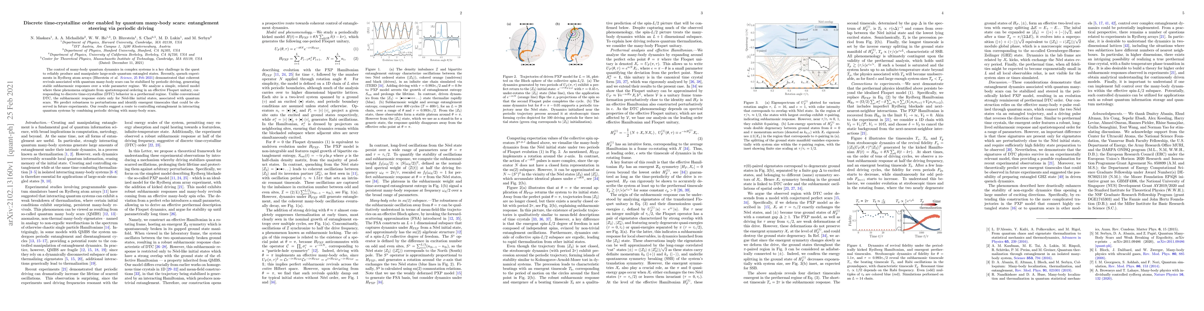This paper investigates the stabilization of quantum many-body scars via periodic driving in Rydberg atom arrays, revealing discrete time-crystalline order and entanglement steering. The study predicts robust subharmonic responses and emergent timescales, suggesting a method to control entanglement through combined periodic driving and quantum scars.