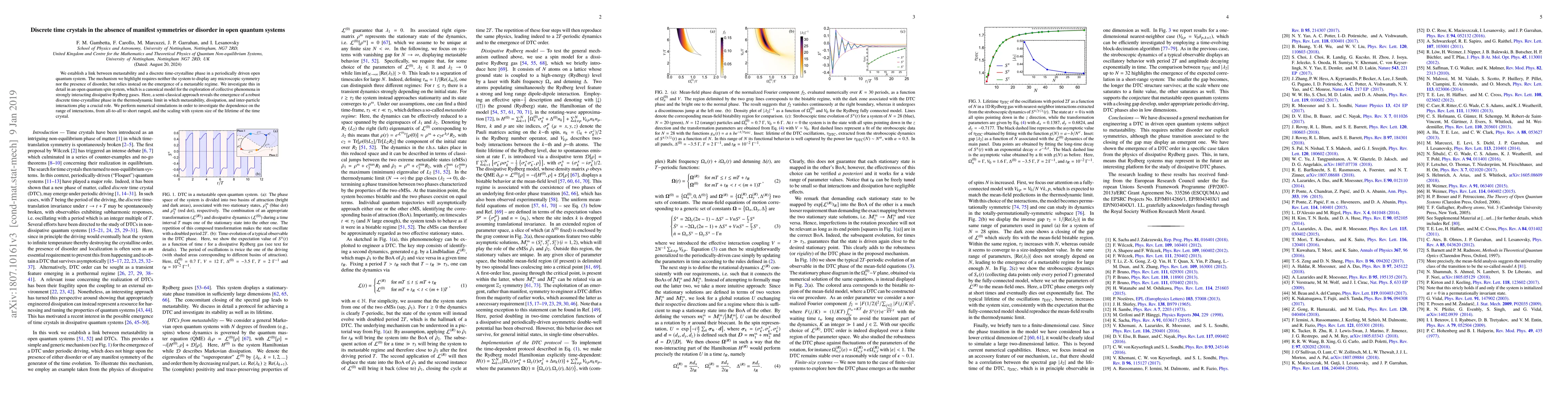 This paper establishes a connection between metastability and a discrete time-crystalline phase in periodically driven open quantum systems, without requiring microscopic symmetries or disorder. Through simulations in a quantum spin system, it demonstrates the emergence of a robust time-crystalline phase driven by metastability, dissipation, and interactions.