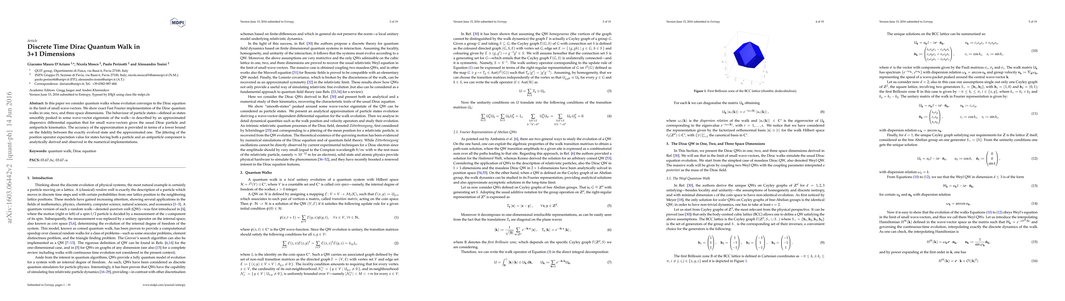 This paper explores quantum walks in discrete time that converge to the Dirac equation in low wave-vector limits, presenting an exact Fast Fourier implementation for dimensions 1 to 3. It describes particle states' behavior through an approximated dispersive differential equation, providing fidelity bounds for accuracy and analytically deriving the position operator's jittering for states with both particle and antiparticle components.
