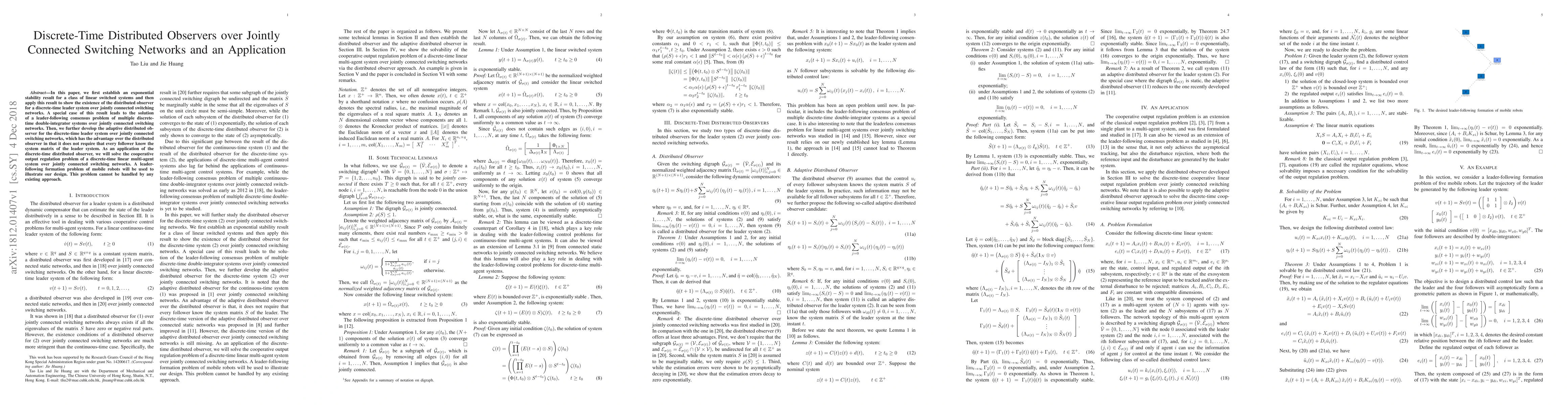This paper establishes exponential stability for linear switched systems and designs a distributed observer for discrete-time leader systems over jointly connected switching networks, solving a leader-following consensus problem. It further develops an adaptive distributed observer that does not require followers to know the leader's system matrix, and applies it to solve cooperative output regulation in multi-agent systems, with a mobile robot formation problem as an example.