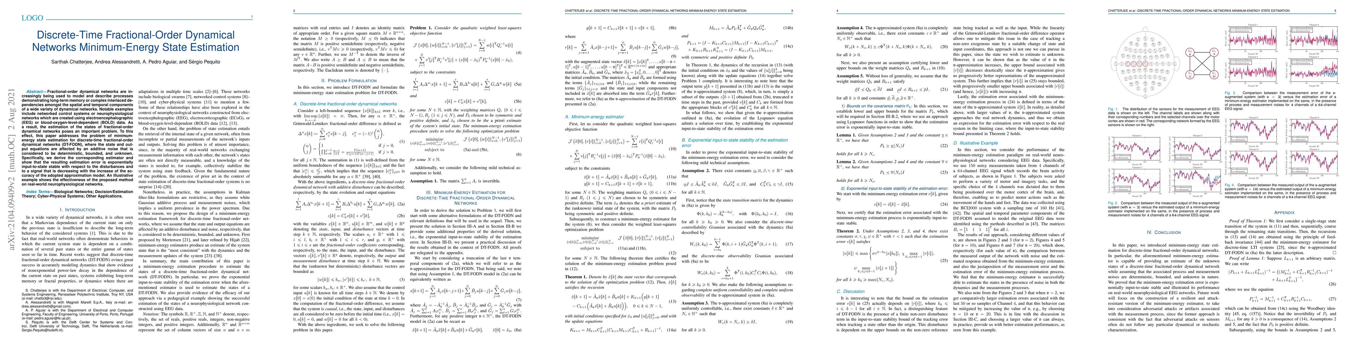 Fractional-order dynamical networks are increasingly being used to model and describe processes demonstrating long-term memory or complex interlaced dependencies amongst the spatial and temporal components of a wide variety of dynamical networks. Notable examples include networked control systems or neurophysiological networks which are created using electroencephalographic (EEG) or blood-oxygen-level-dependent (BOLD) data. As a result, the estimation of the states of fractional-order dynamical networks poses an important problem. To this effect, this paper addresses the problem of minimum-energy state estimation for discrete-time fractional-order dynamical networks (DT-FODN), where the state and output equations are affected by an additive noise that is considered to be deterministic, bounded, and unknown. Specifically, we derive the corresponding estimator and show that the resulting estimation error is exponentially input-to-state stable with respect to the disturbances and to a signal that is decreasing with the increase of the accuracy of the adopted approximation model. An illustrative example shows the effectiveness of the proposed method on real-world neurophysiological networks.