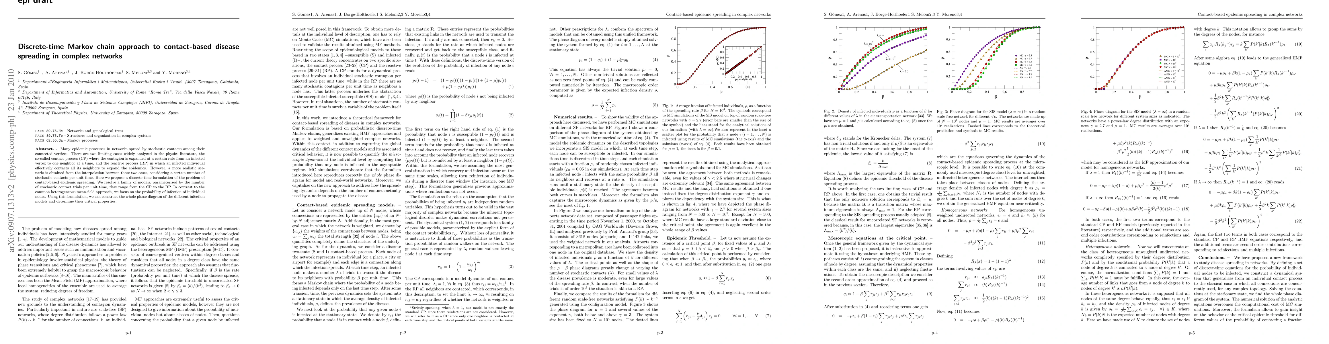 This paper proposes a discrete-time Markov chain model to study contact-based disease spreading in complex networks, interpolating between the contact process and the reactive process. The authors analyze the probability of infection at individual nodes and construct the phase diagram to determine critical properties.