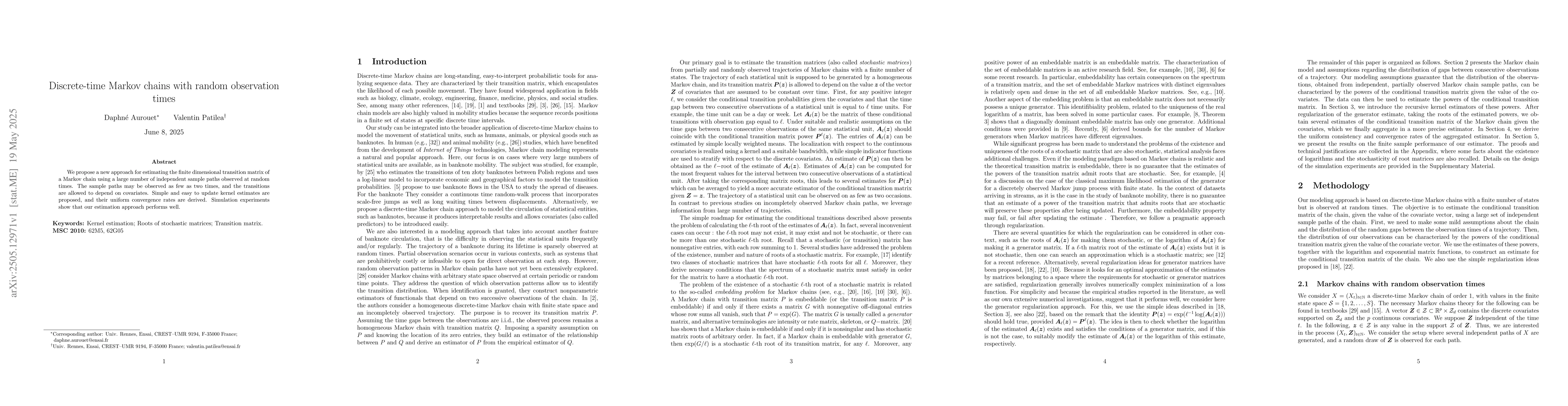 The research proposes a novel approach for estimating the finite dimensional transition matrix of a Markov chain, utilizing a large number of independent sample paths observed at random times. It allows for transitions to depend on covariates and presents simple, easy-to-update kernel estimates with derived uniform convergence rates.