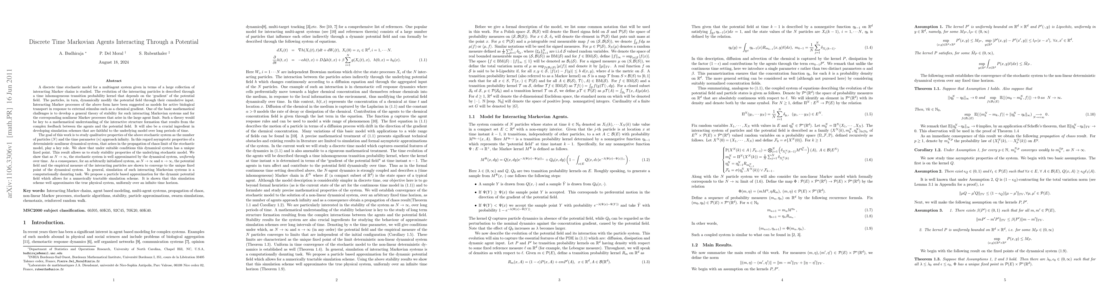 A discrete time stochastic model for a multiagent system given in terms of a large collection of interacting Markov chains is studied. The evolution of the interacting particles is described through a time inhomogeneous transition probability kernel that depends on the 'gradient' of the potential field. The particles, in turn, dynamically modify the potential field through their cumulative input. Interacting Markov processes of the above form have been suggested as models for active biological transport in response to external stimulus such as a chemical gradient. One of the basic mathematical challenges is to develop a general theory of stability for such interacting Markovian systems and for the corresponding nonlinear Markov processes that arise in the large agent limit. Such a theory would be key to a mathematical understanding of the interactive structure formation that results from the complex feedback between the agents and the potential field. It will also be a crucial ingredient in developing simulation schemes that are faithful to the underlying model over long periods of time. The goal of this work is to study qualitative properties of the above stochastic system as the number of particles (N) and the time parameter (n) approach infinity. In this regard asymptotic properties of a deterministic nonlinear dynamical system, that arises in the propagation of chaos limit of the stochastic model, play a key role. We show that under suitable conditions this dynamical system has a unique fixed point. This result allows us to study stability properties of the underlying stochastic model. We show that as N \rightarrow \infty, the stochastic system is well approximated by the dynamical system, uniformly over time. As a consequence, for an arbitrarily initialized system, as N\rightarrow \infty and n \rightarrow \infty, the potential field and the empirical measure of the interacting particles are shown to converge to the unique fixed point of the dynamical system. In general, simulation of such interacting Markovian systems is a computationally daunting task. We propose a particle based approximation for the dynamic potential field which allows for a numerically tractable simulation scheme. It is shown that this simulation scheme well approximates the true physical system, uniformly over an infinite time horizon.