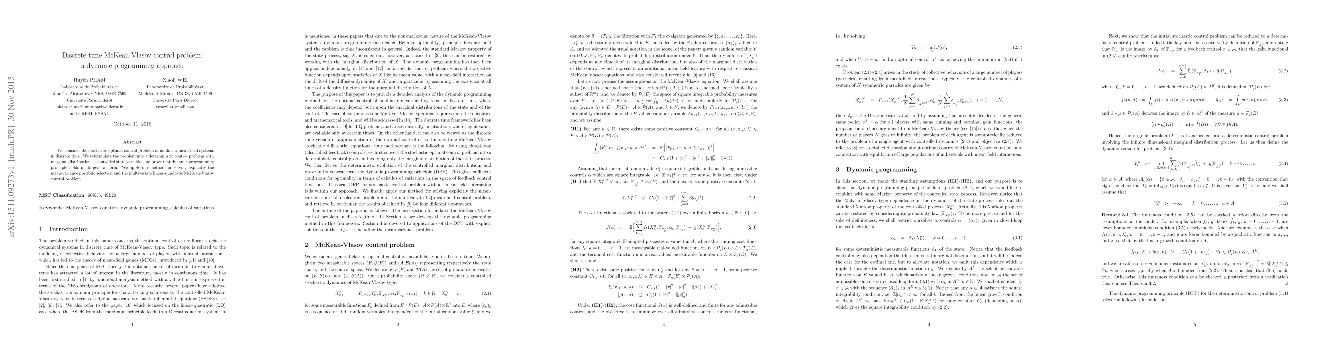 This paper reformulates the stochastic optimal control problem for nonlinear mean-field systems in discrete time into a deterministic control problem, proving the dynamic programming principle holds. It applies this method to solve the mean-variance portfolio selection and the multivariate linear-quadratic McKean-Vlasov control problem explicitly.