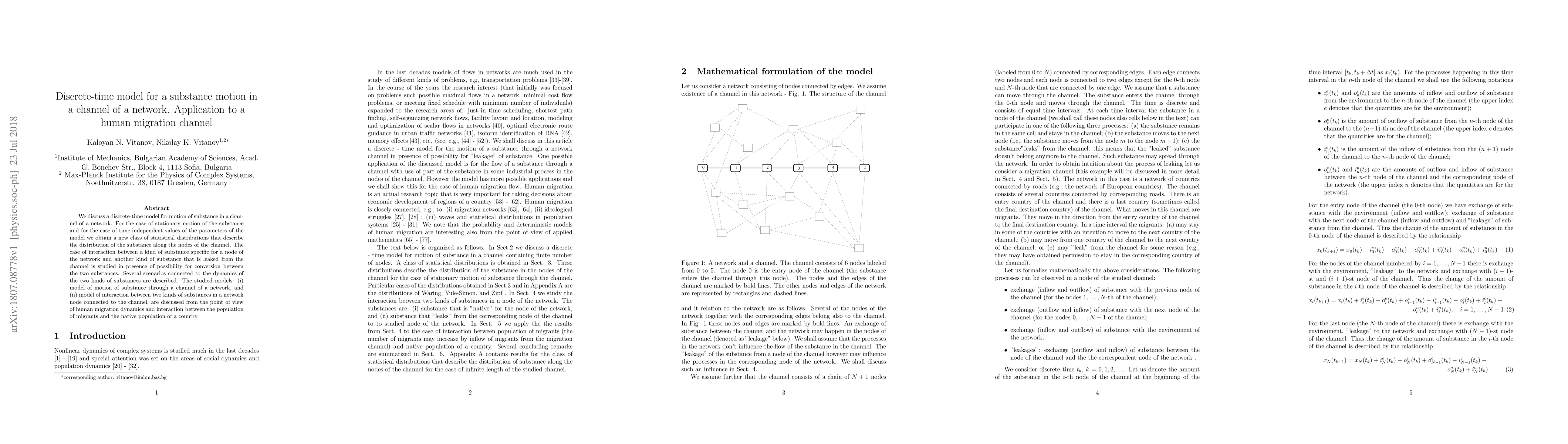 We discuss a discrete-time model for motion of substance in a channel of a network. For the case of stationary motion of the substance and for the case of time-independent values of the parameters of the model we obtain a new class of statistical distributions that describe the distribution of the substance along the nodes of the channel. The case of interaction between a kind of substance specific for a node of the network and another kind of substance that is leaked from the channel is studied in presence of possibility for conversion between the two substances. Several scenarios connected to the dynamics of the two kinds of substances are described. The studied models: (i) model of motion of substance through a channel of a network, and (ii) model of interaction between two kinds of substances in a network node connected to the channel, are discussed from the point of view of human migration dynamics and interaction between the population of migrants and the native population of a country.