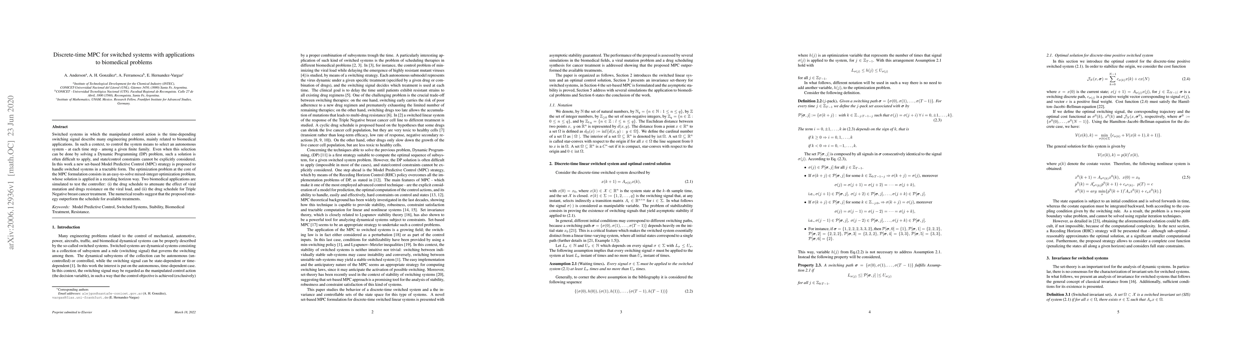 Switched systems in which the manipulated control action is the time-depending switching signal describe many engineering problems, mainly related to biomedical applications. In such a context, to control the system means to select an autonomous system - at each time step - among a given finite family. Even when this selection can be done by solving a Dynamic Programming (DP) problem, such a solution is often difficult to apply, and state/control constraints cannot be explicitly considered. In this work a new set-based Model Predictive Control (MPC) strategy is proposed to handle switched systems in a tractable form. The optimization problem at the core of the MPC formulation consists in an easy-to-solve mixed-integer optimization problem, whose solution is applied in a receding horizon way. Two biomedical applications are simulated to test the controller: (i) the drug schedule to attenuate the effect of viral mutation and drugs resistance on the viral load, and (ii) the drug schedule for Triple Negative breast cancer treatment. The numerical results suggest that the proposed strategy outperform the schedule for available treatments.