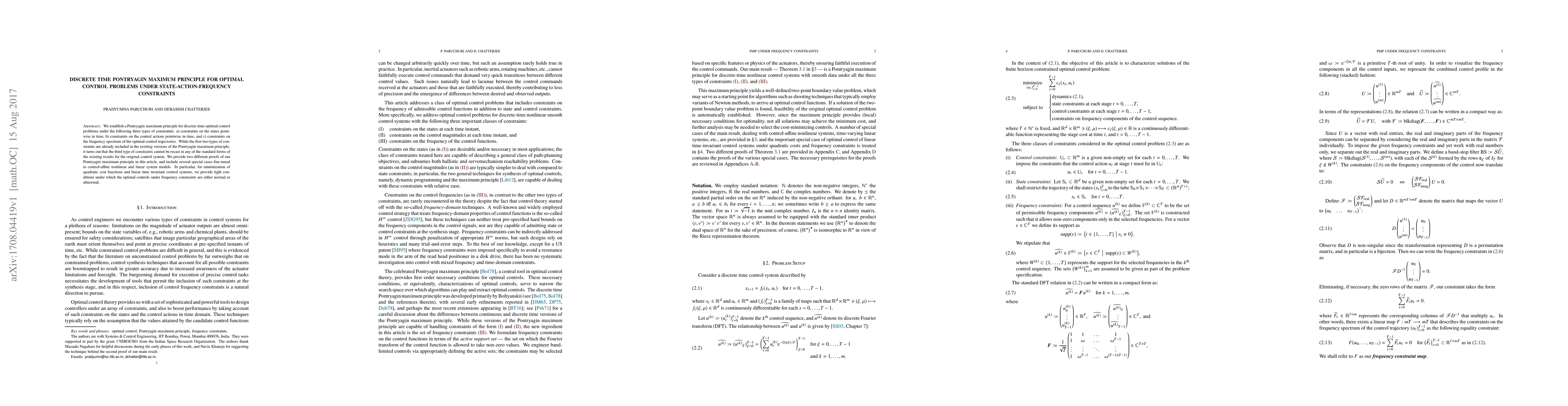 This paper establishes a Pontryagin maximum principle for discrete time optimal control problems with constraints on states, control actions, and frequency spectrum. Two proofs are provided, and special cases for control-affine nonlinear and linear systems are analyzed, especially focusing on frequency-constrained optimal controls in quadratic cost minimization.