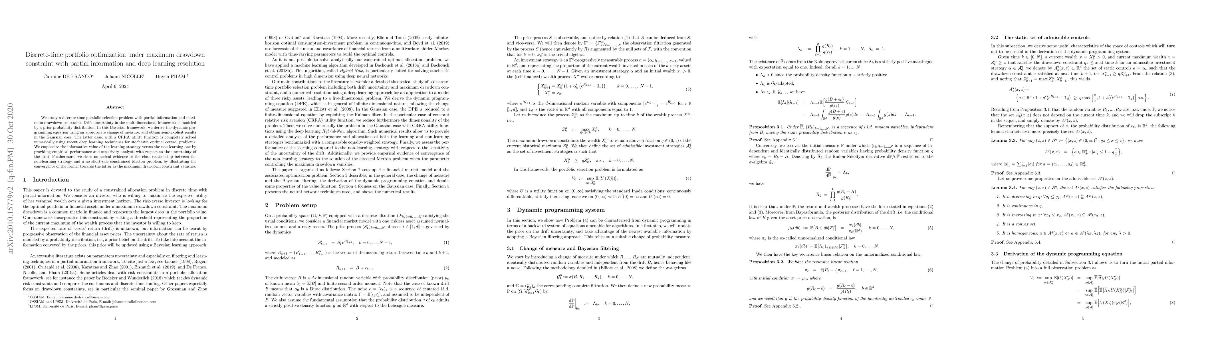 This paper explores a discrete-time portfolio optimization problem under a maximum drawdown constraint with partial information, employing a Bayesian approach and deep learning for resolution. It derives dynamic programming equations and solves the Gaussian case using deep learning, comparing its performance against traditional methods.