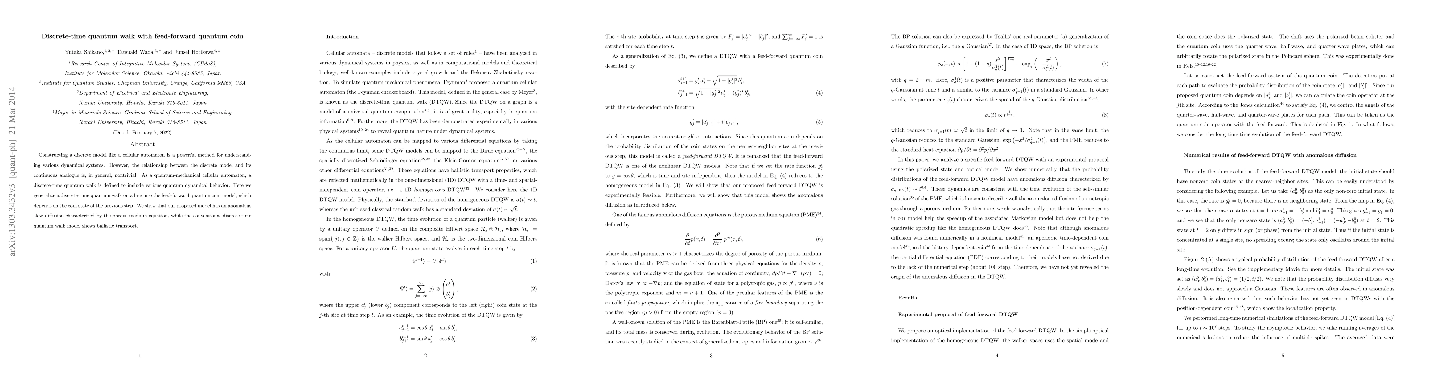 Constructing a discrete model like a cellular automaton is a powerful method for understanding various dynamical systems. However, the relationship between the discrete model and its continuous analogue is, in general, nontrivial. As a quantum-mechanical cellular automaton, a discrete-time quantum walk is defined to include various quantum dynamical behavior. Here we generalize a discrete-time quantum walk on a line into the feed-forward quantum coin model, which depends on the coin state of the previous step. We show that our proposed model has an anomalous slow diffusion characterized by the porous-medium equation, while the conventional discrete-time quantum walk model shows ballistic transport.