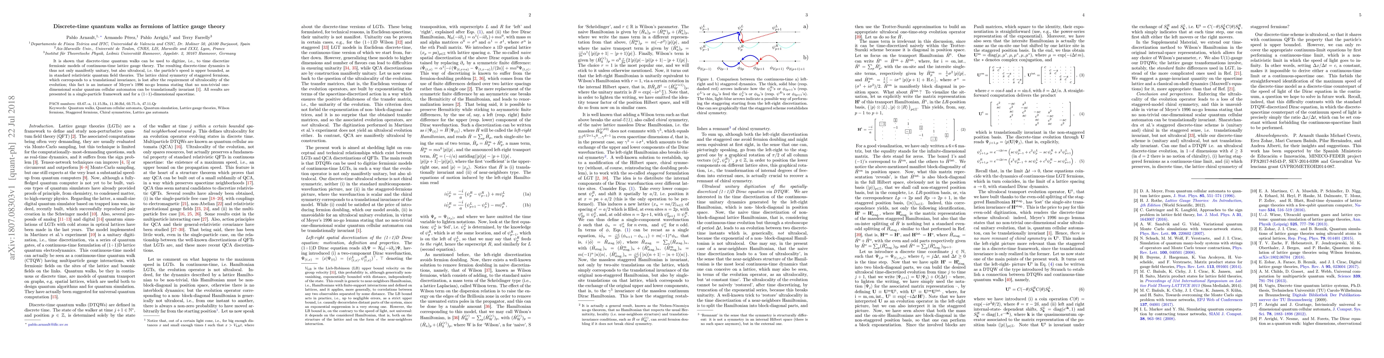 This paper demonstrates that discrete-time quantum walks can digitize continuous-time lattice gauge theory models for fermions, maintaining unitarity and ultralocality. However, the digitization process results in the loss of lattice chiral symmetry, consistent with Meyer's no-go theorem on translational invariance in quantum cellular automata.