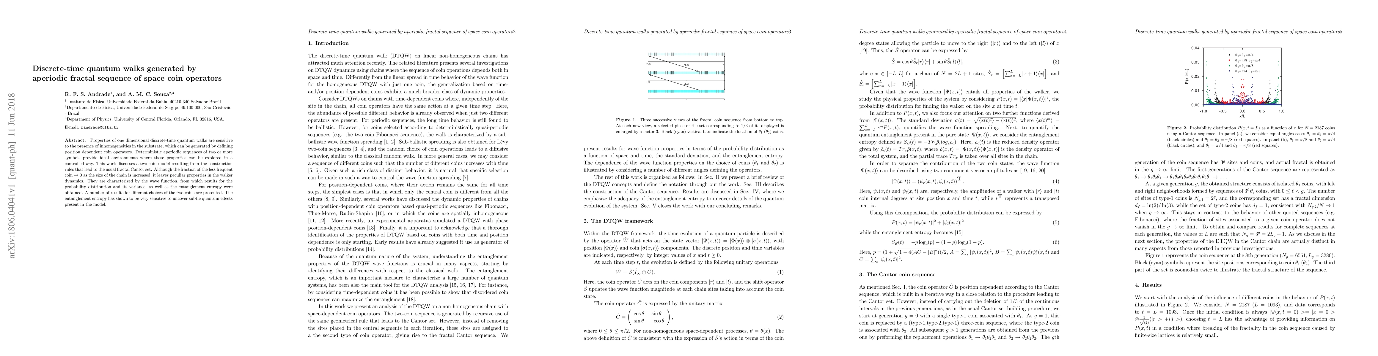 This paper investigates the dynamics of one-dimensional discrete-time quantum walks under position-dependent coin operators derived from an aperiodic fractal sequence, specifically the Cantor set. The study reveals unique properties in the walker's probability distribution, variance, and entanglement entropy, highlighting the sensitivity of entanglement entropy in detecting quantum effects.
