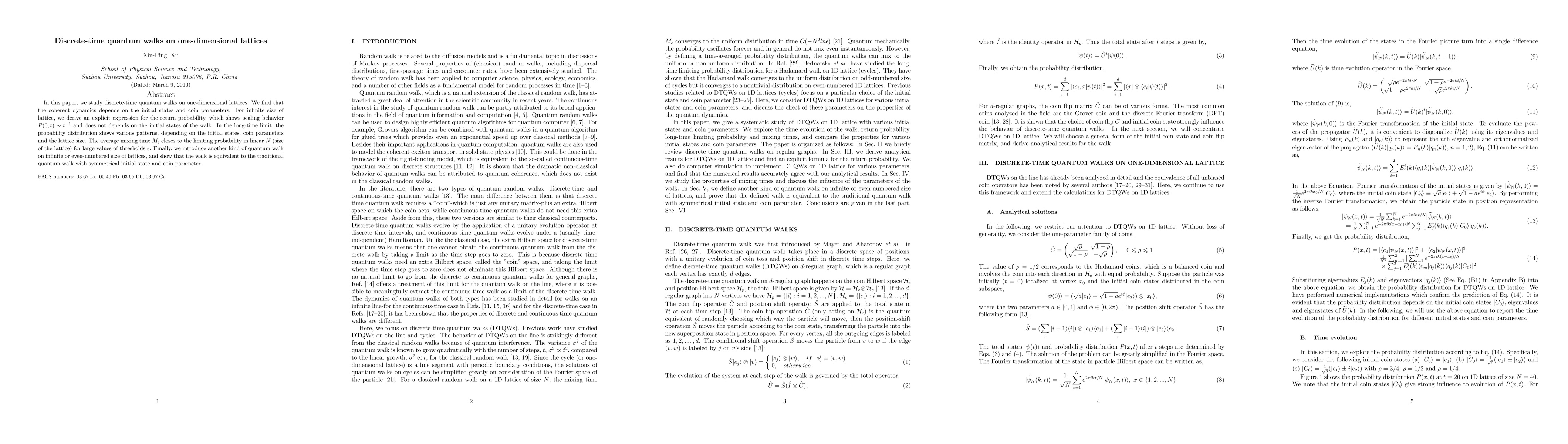 This paper investigates discrete-time quantum walks on one-dimensional lattices, revealing that coherent dynamics depend on initial states and coin parameters. For infinite lattices, it derives a return probability scaling as $P(0,t)\sim t^{-1}$, independent of initial states, and discusses long-time probability distributions influenced by various parameters.
