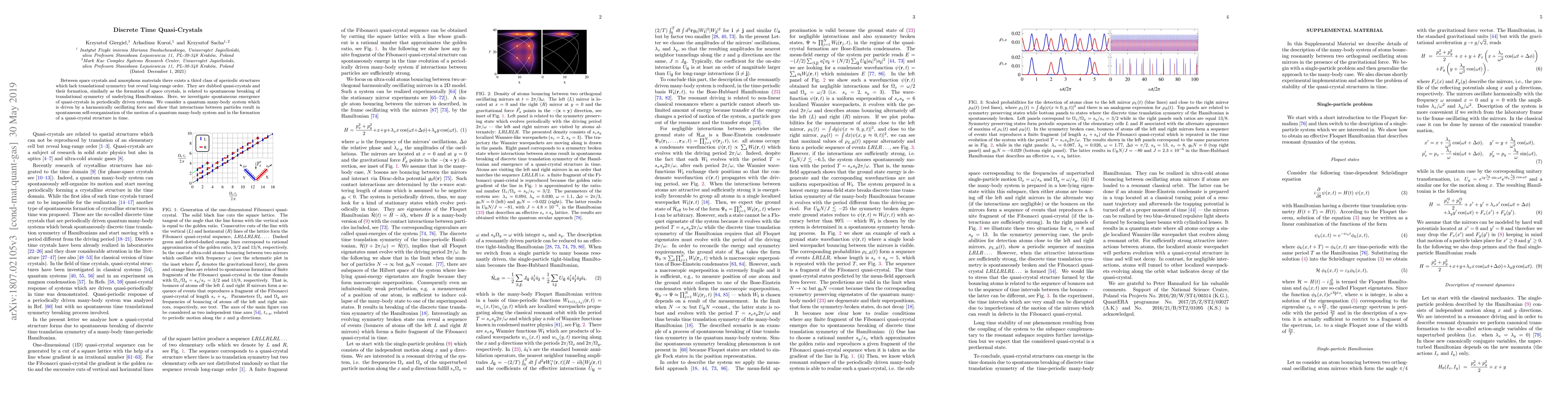 This paper explores the spontaneous emergence of quasi-crystal structures in periodically driven quantum many-body systems. It demonstrates that interactions among particles can lead to the self-organization of motion, resulting in a quasi-crystal structure in discrete time.